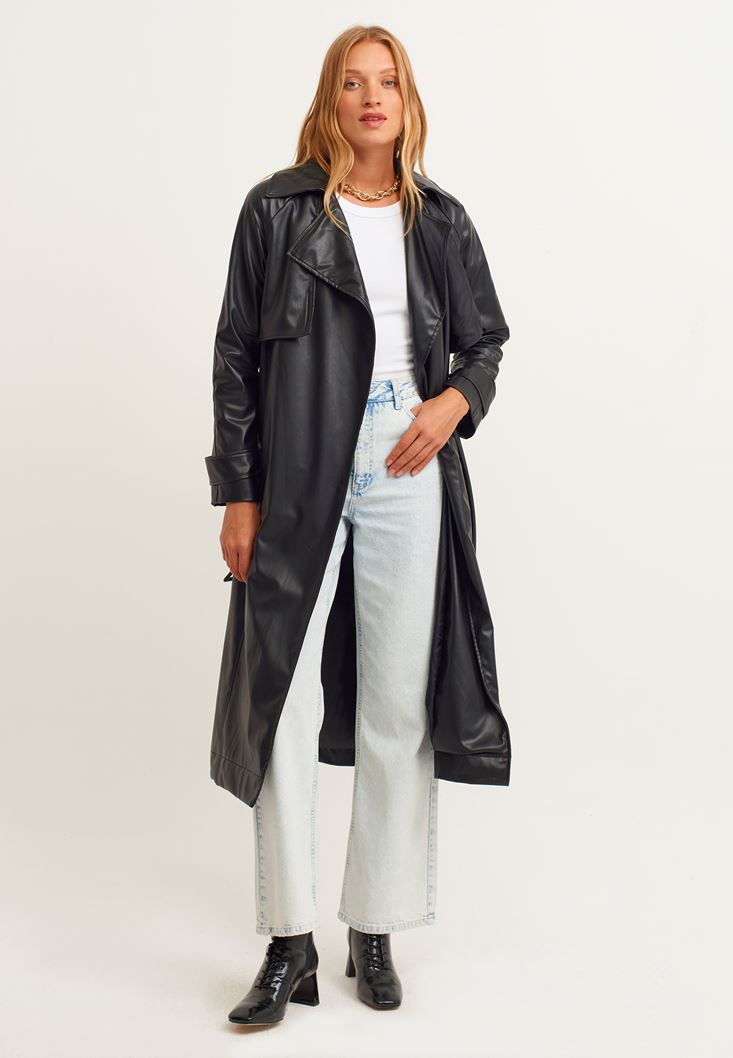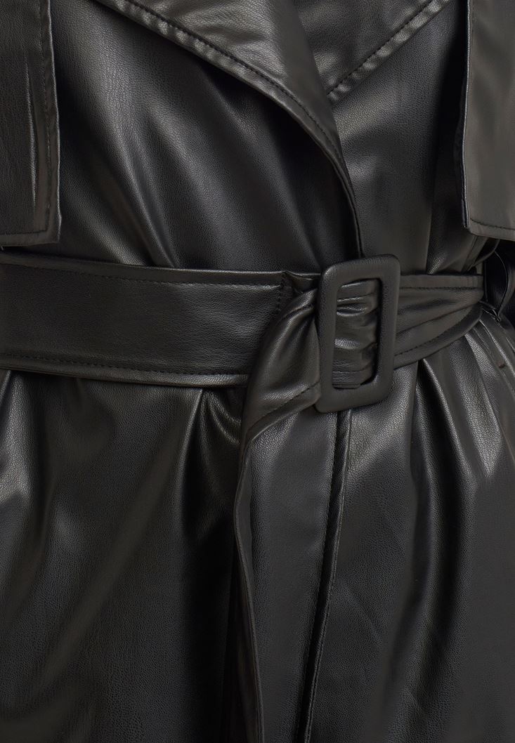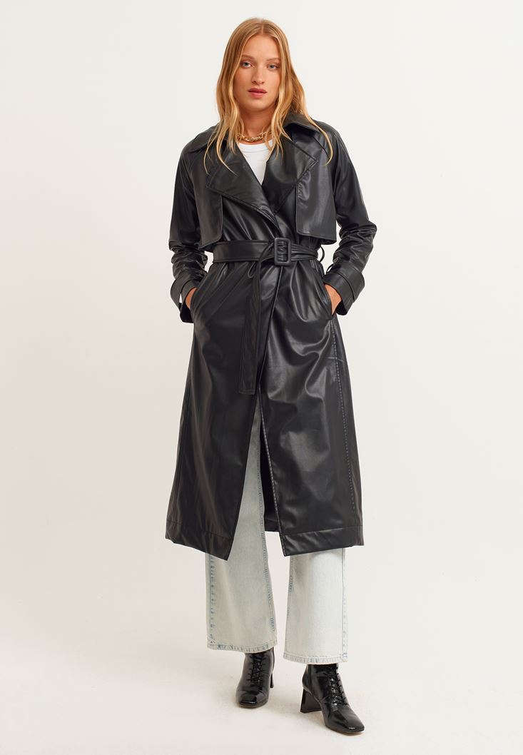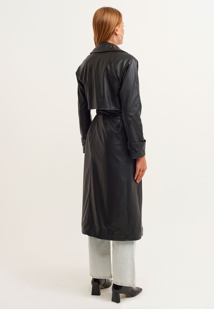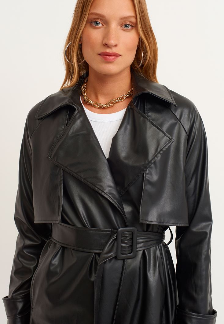 Vegan deri doku, kendi kumaşından kemerli, ön ve arka kısmı ekstra kumaş detaylı, manşet kısımları kemerli, uzun boy, iki cepli.