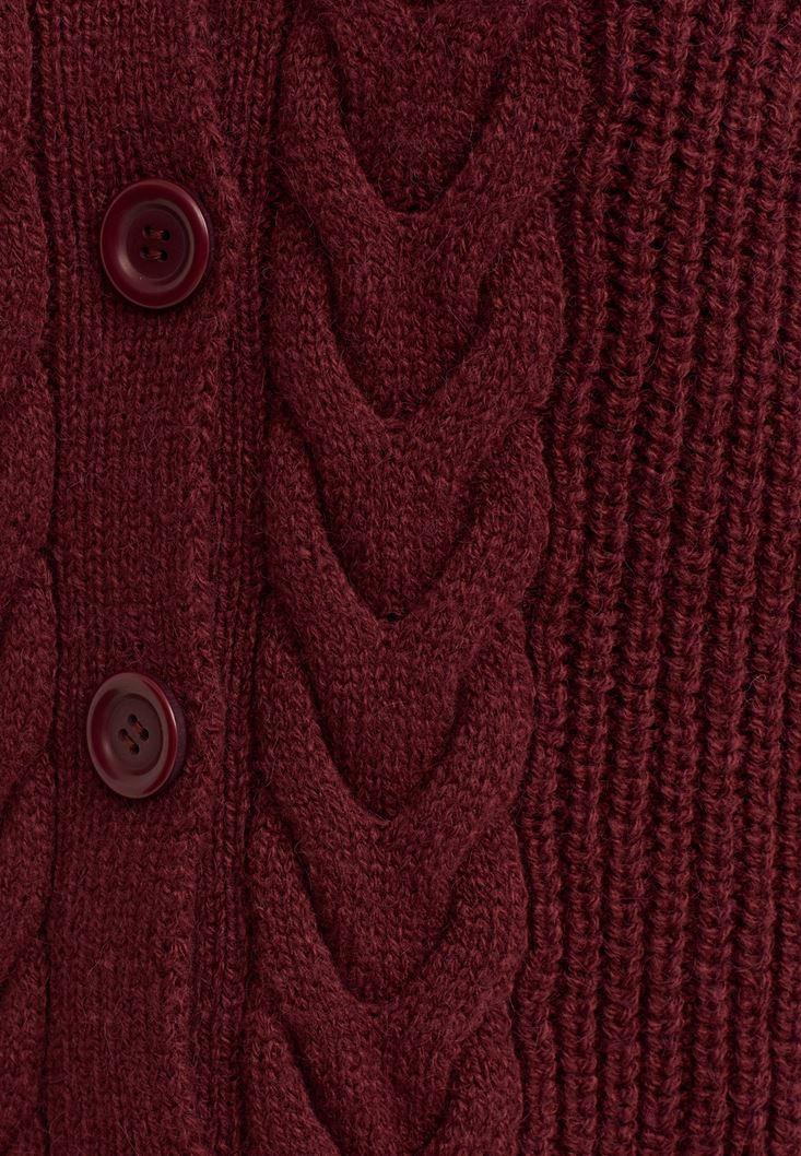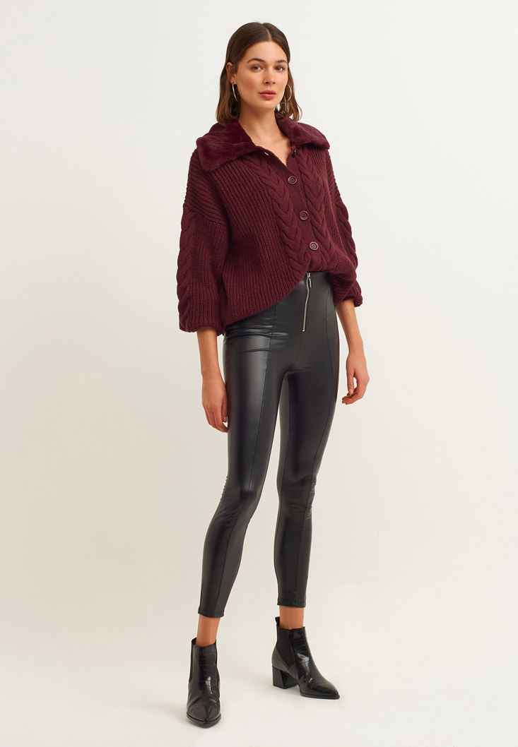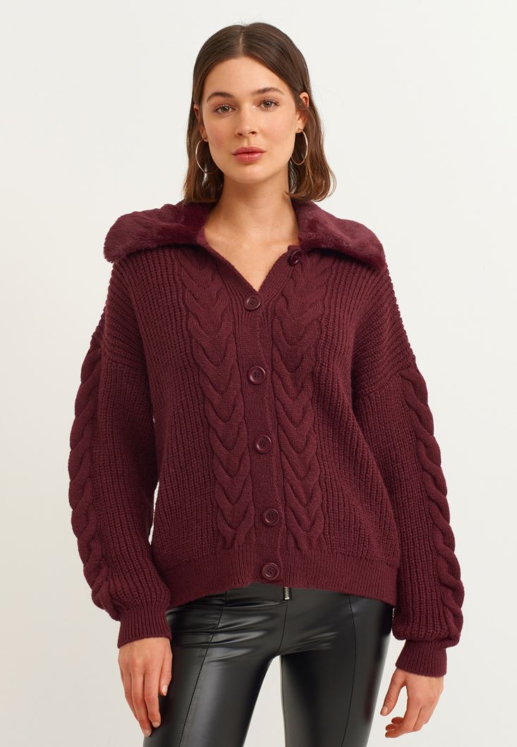 • Bayan Bordo Vegan Kürk Detaylı Triko Hırka