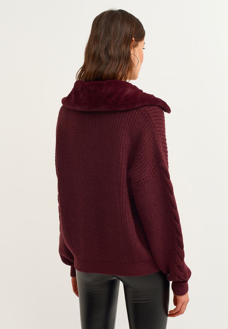 Bordo Vegan Kürk Detaylı Triko Hırka