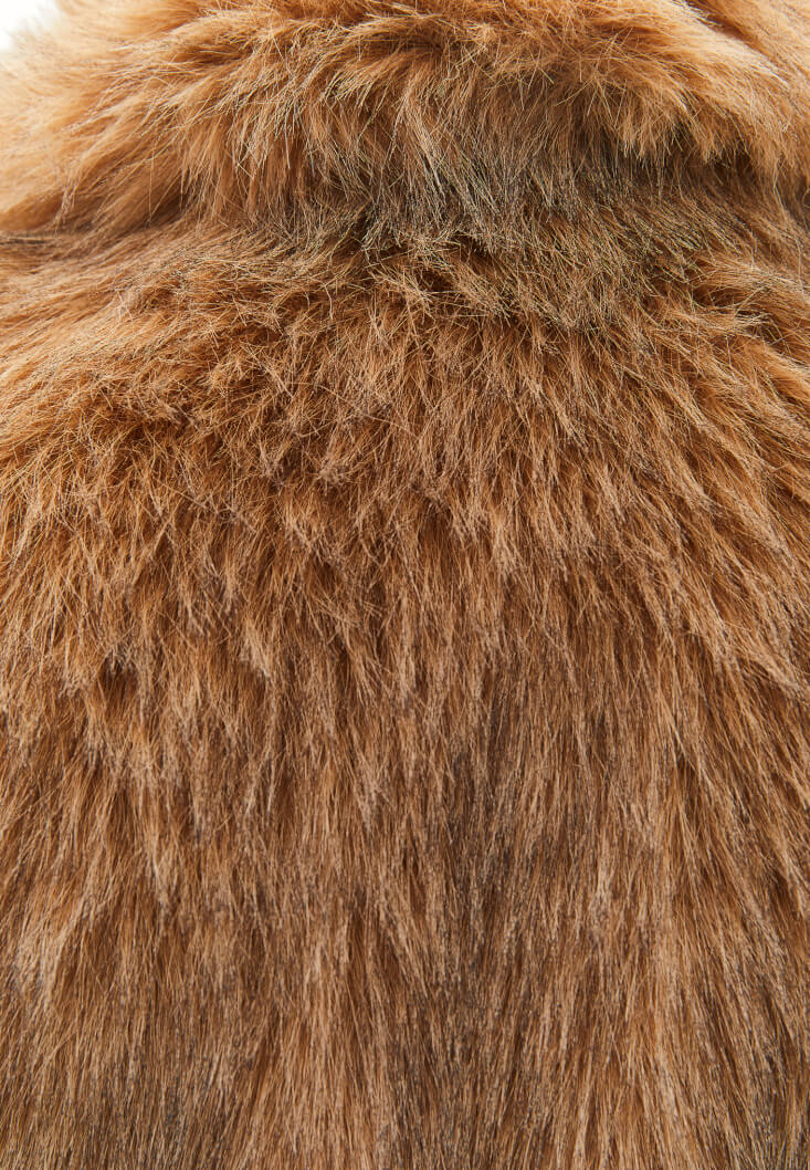 Yumuşak tuşeli vegan kürk doku, V yaka, bedene yakın fit, crop kesim, agraflı kapama detayı, içi astarlı.