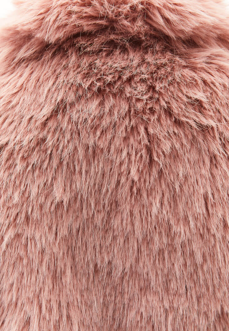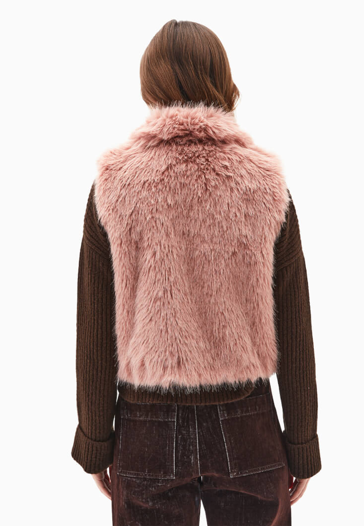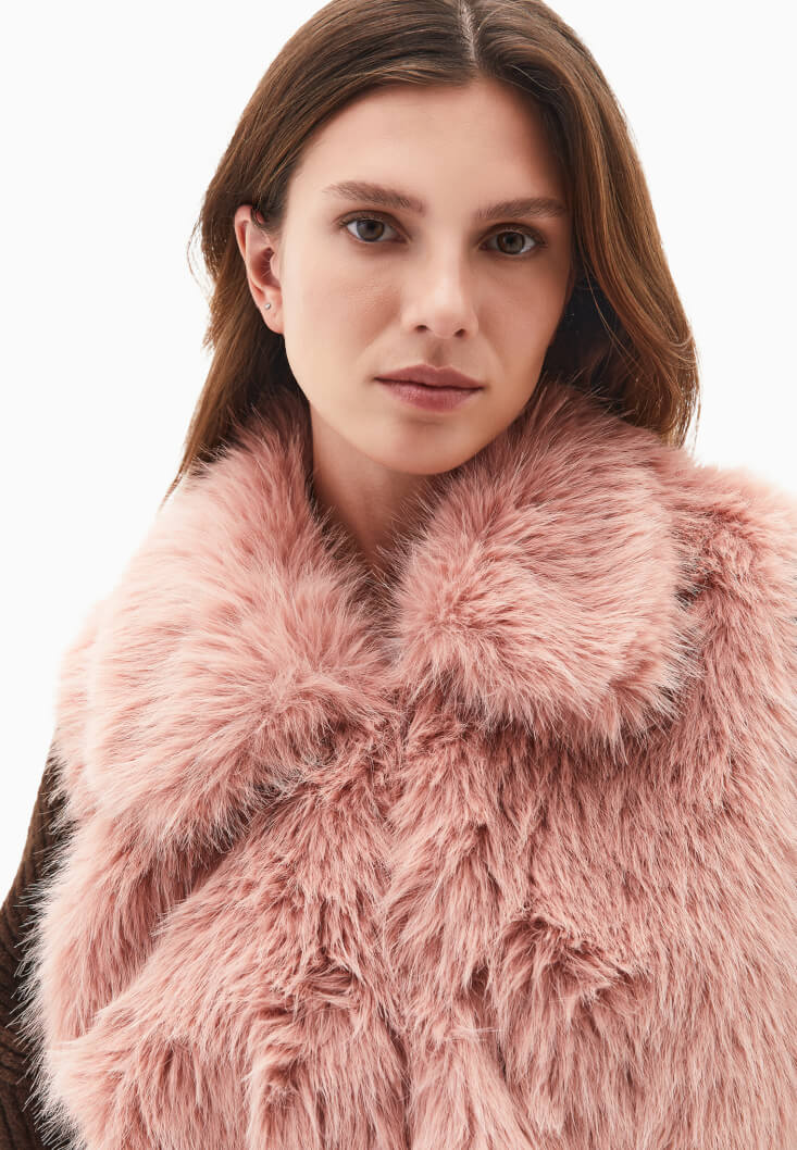 Yumuşak tuşeli vegan kürk doku, V yaka, bedene yakın fit, crop kesim, agraflı kapama detayı, içi astarlı.