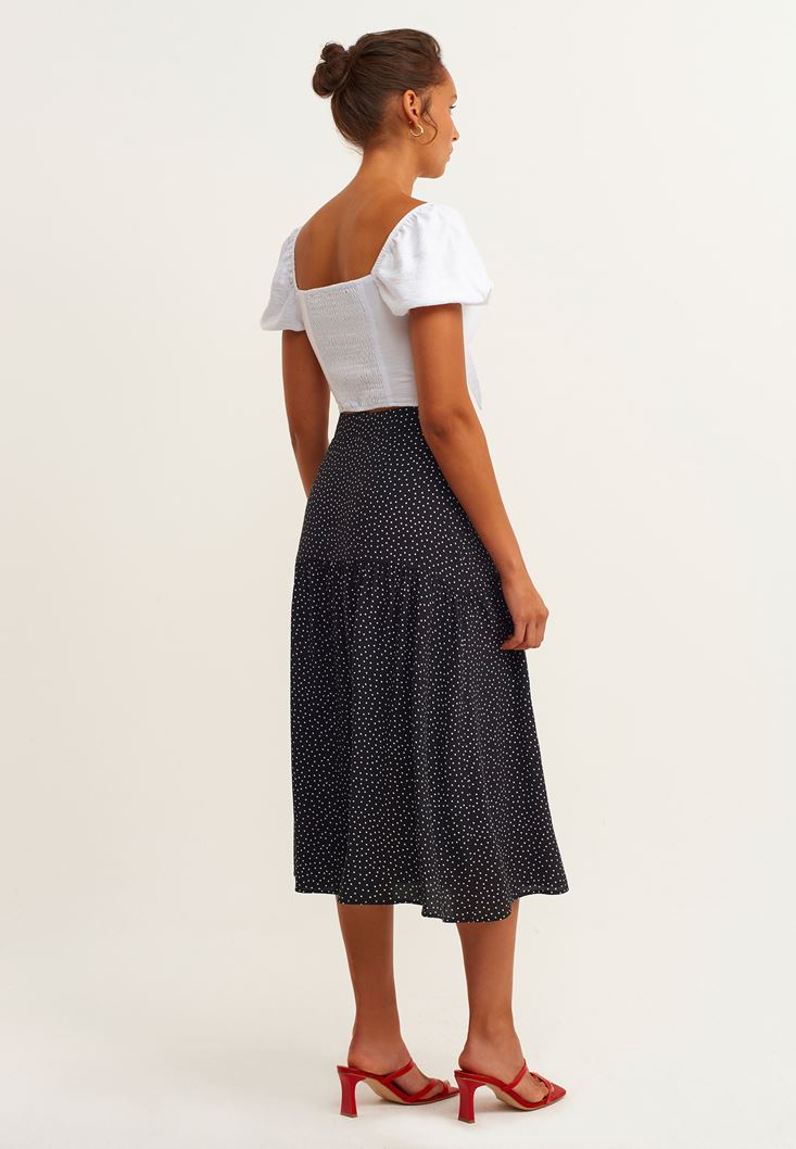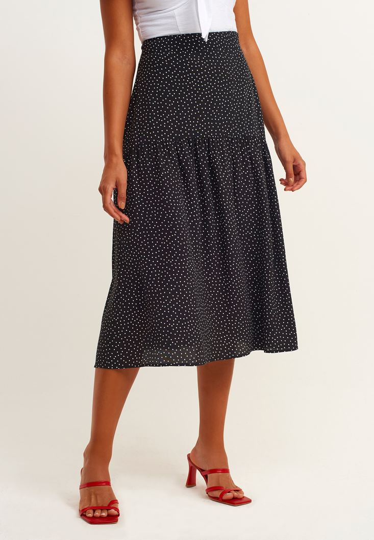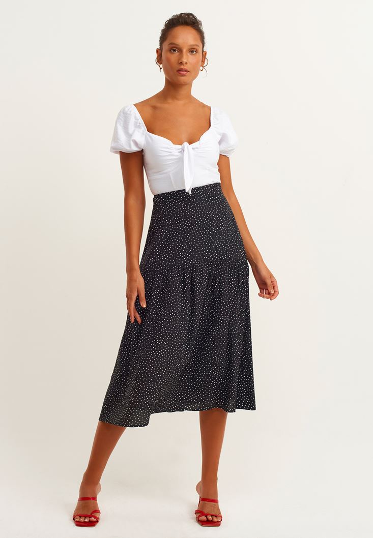Beyaz Puantiye Volan Detaylı Desenli Etek