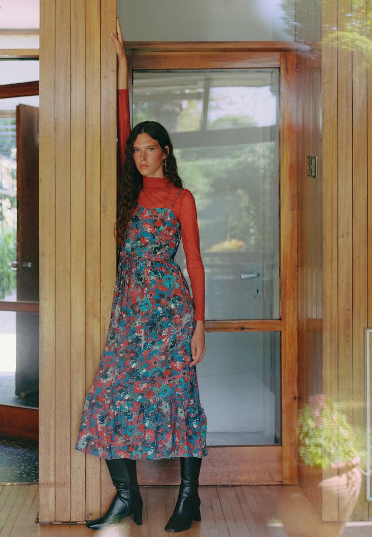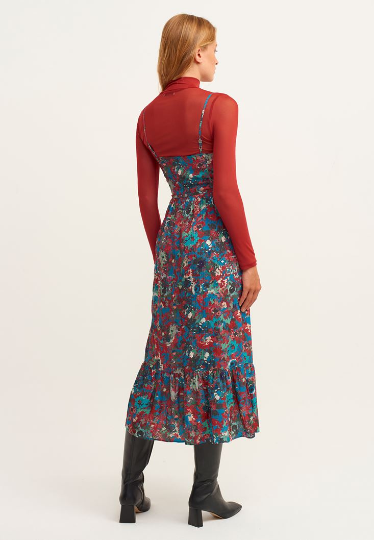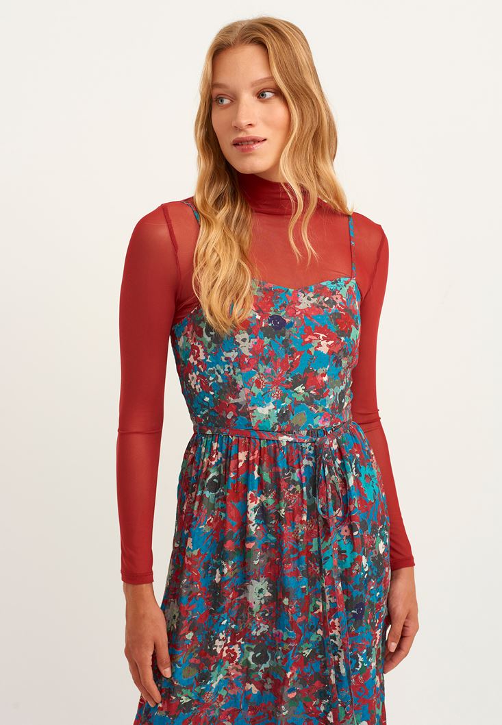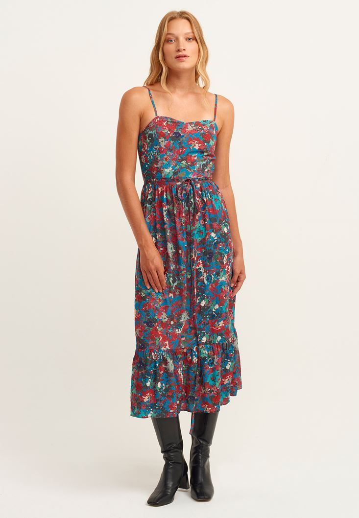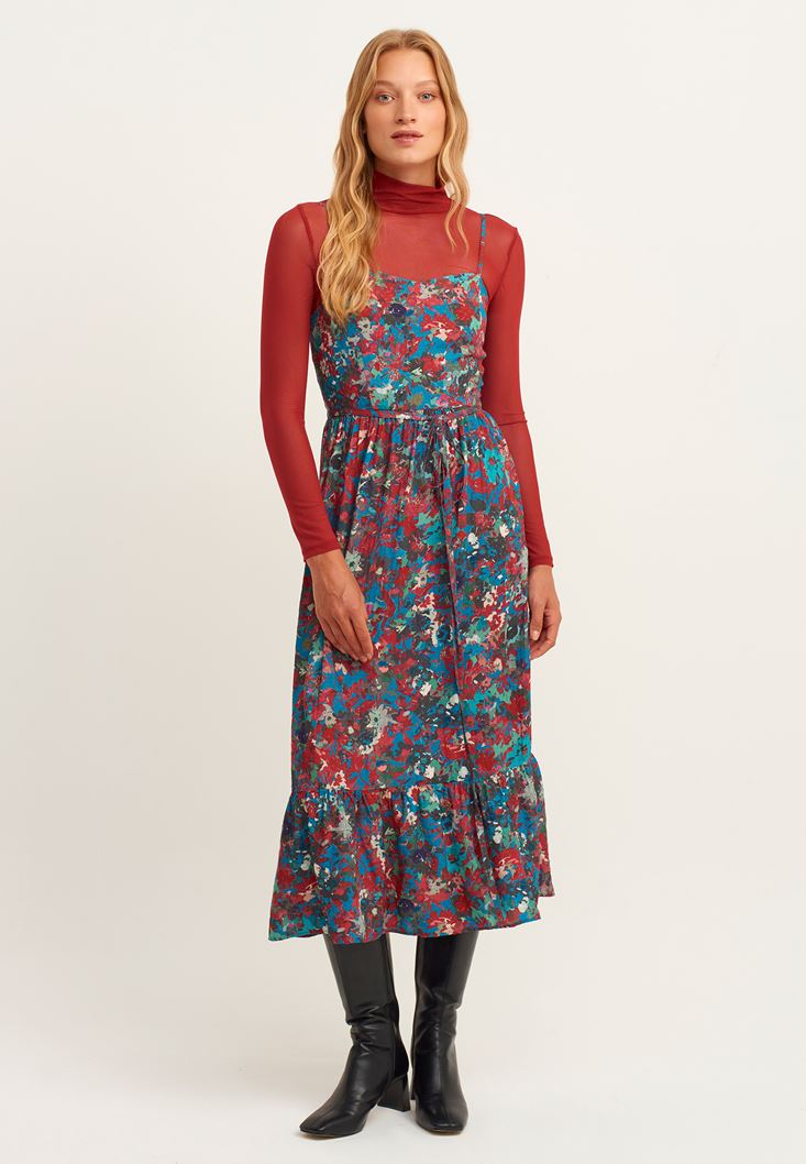 %100 viskon içerikli doku, floral desenli, ince askılı, beli büzgülü ve bağcık detaylı, etek ucu fırfırlı, midi boy.