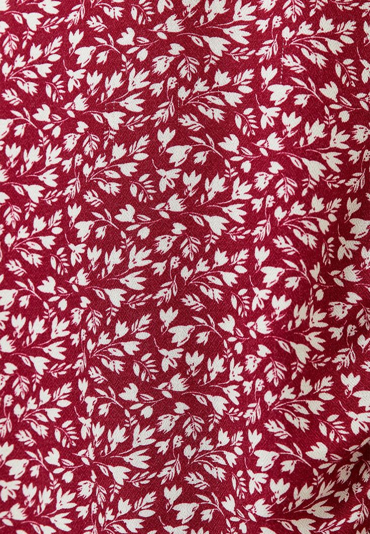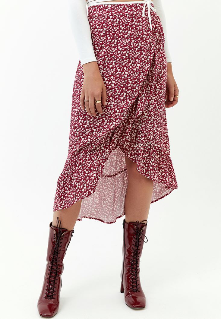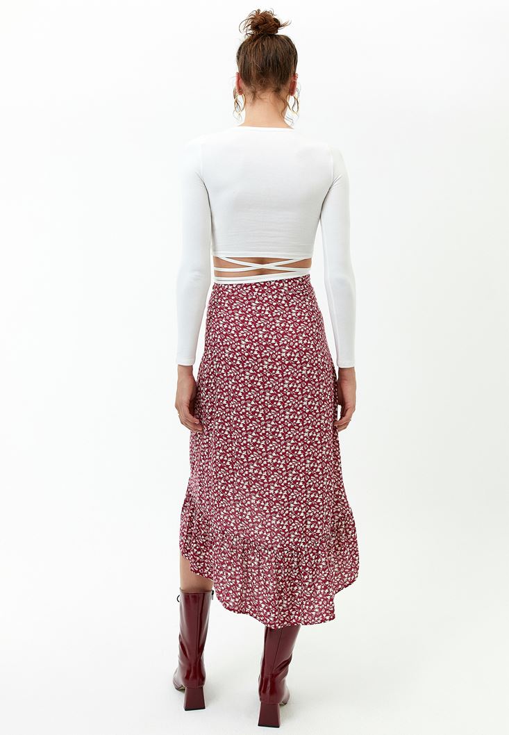 %100 viskon içerikli doku, floral desenli, yüksek bel, midi boy, etek ucu fırfırlı, kruvaze tasarım, beli düğme kapamalı.