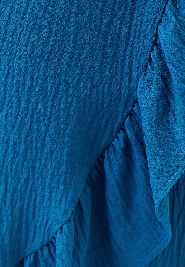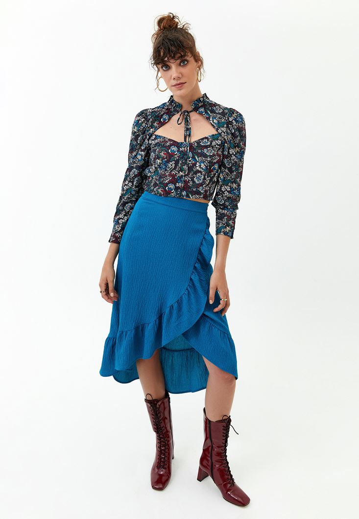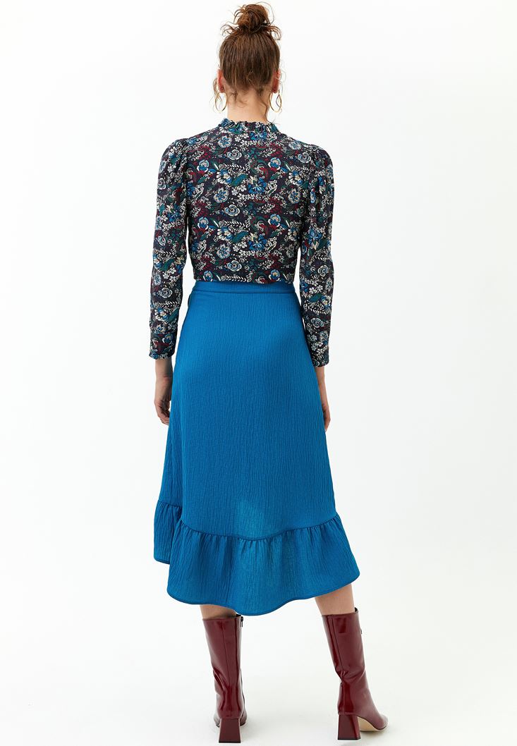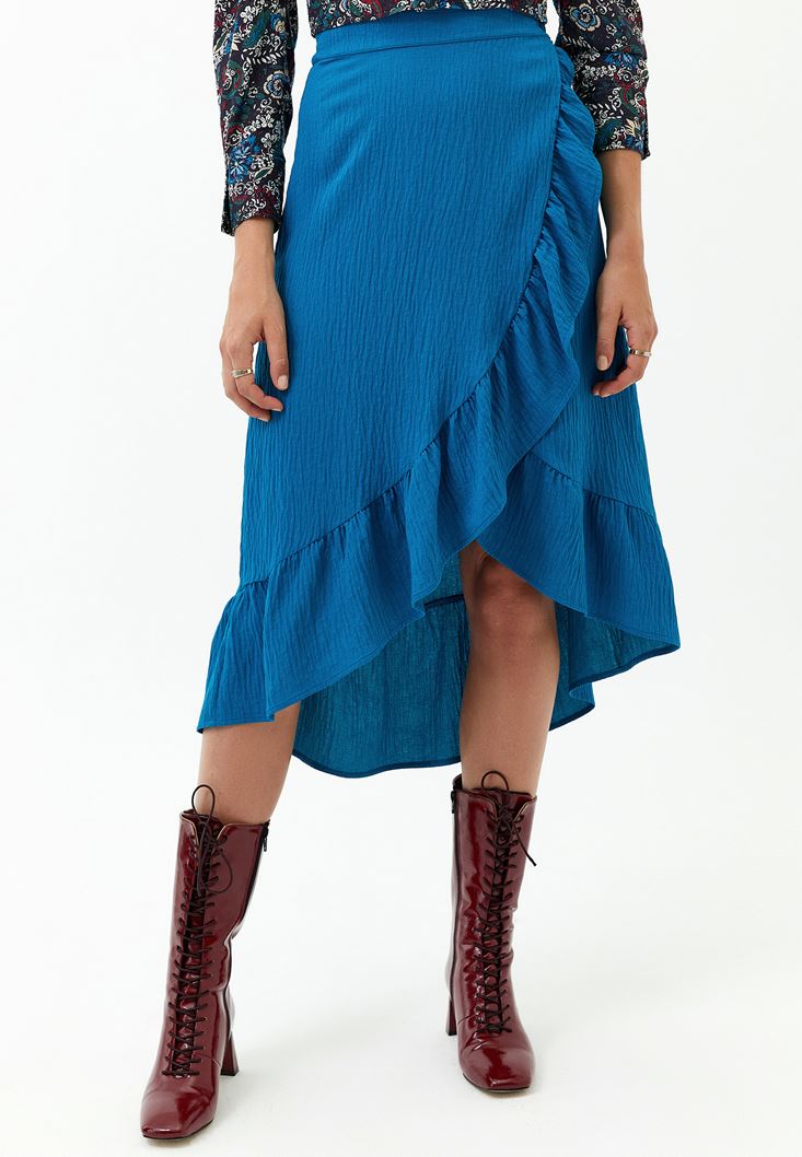 Viskon karışımlı özel doku, yüksek bel, etek ucu volanlı, kruvaze kapamalı, bel kısmı düğme kapamalı, A-line kesim, midi boy.