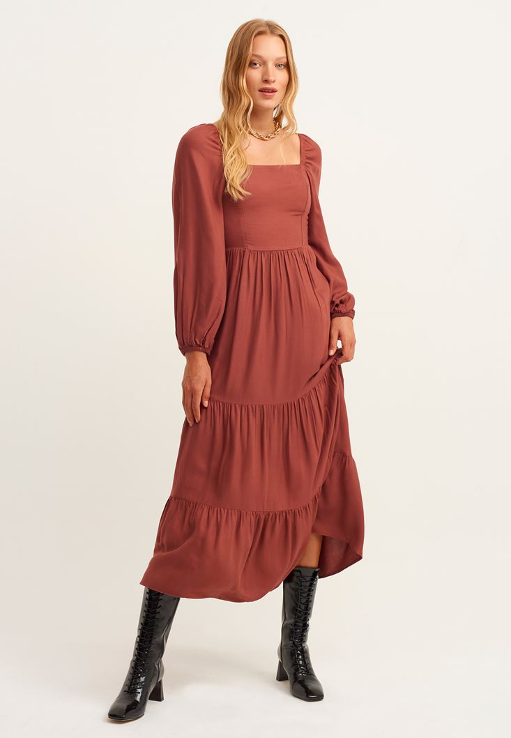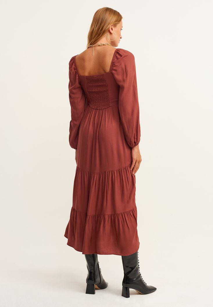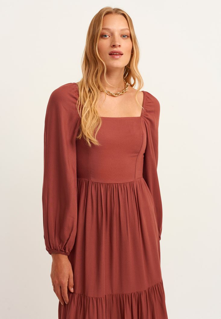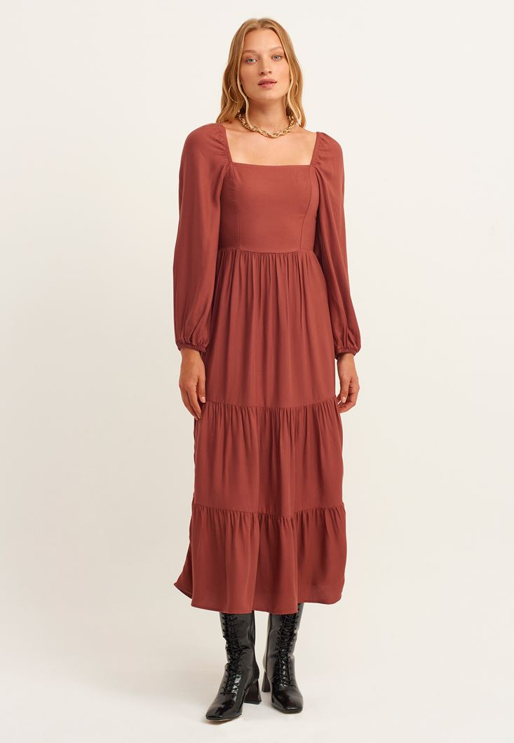 • Bayan Kahverengi Volanlı Uzun Elbise