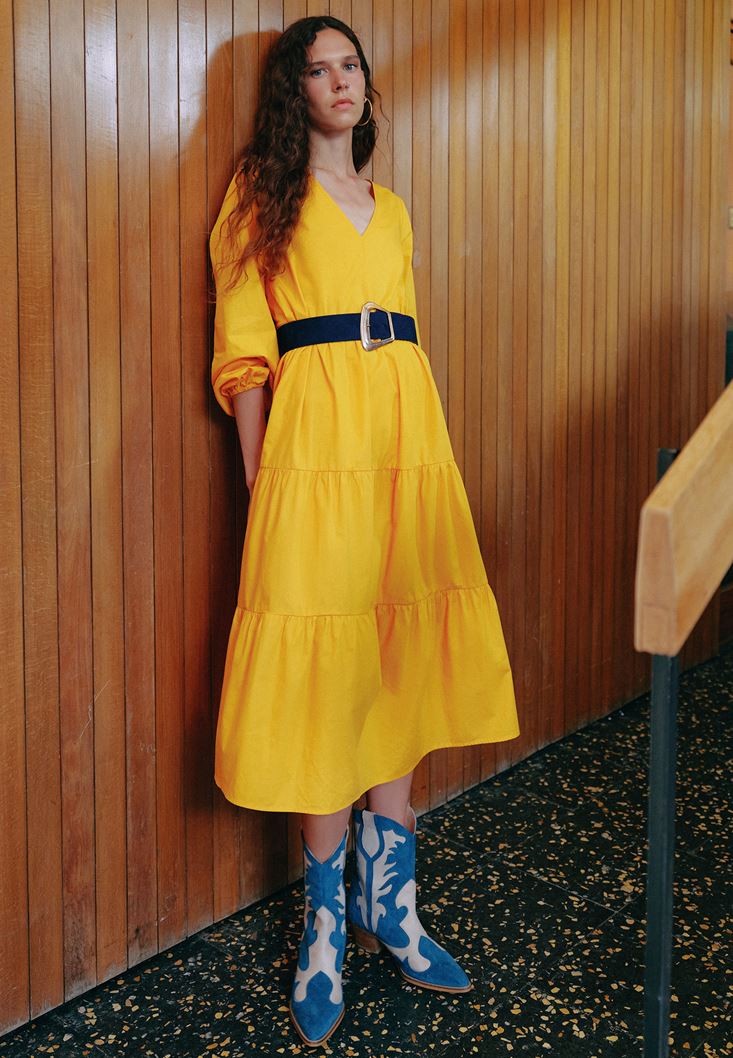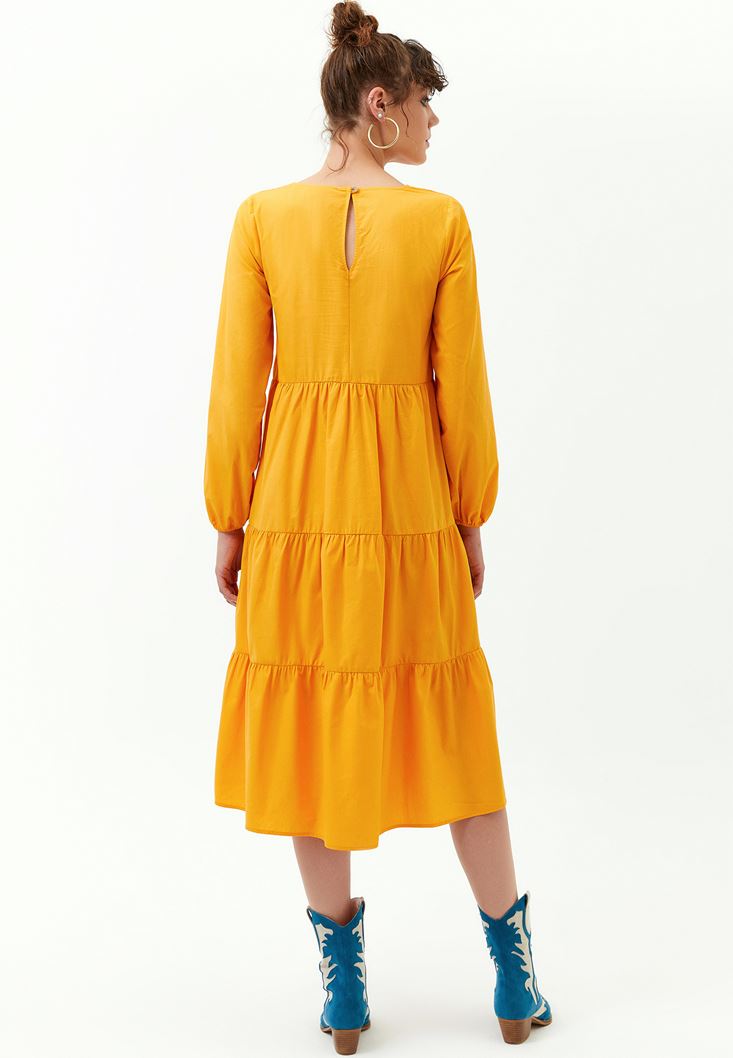 %100 pamuklu doku, katlı volanlı etek tasarımı, V yaka, kol ucu lastikli, bedenden uzak rahat form, uzun boy ve uzun kol.