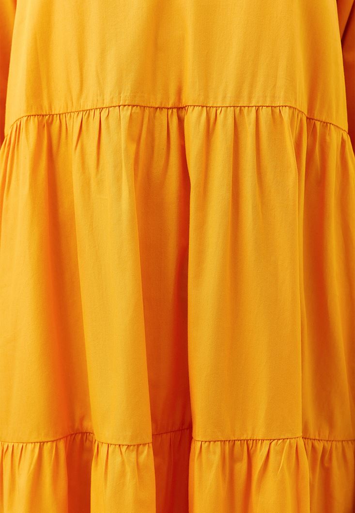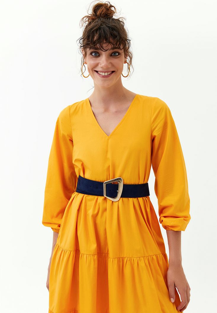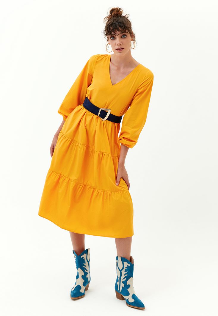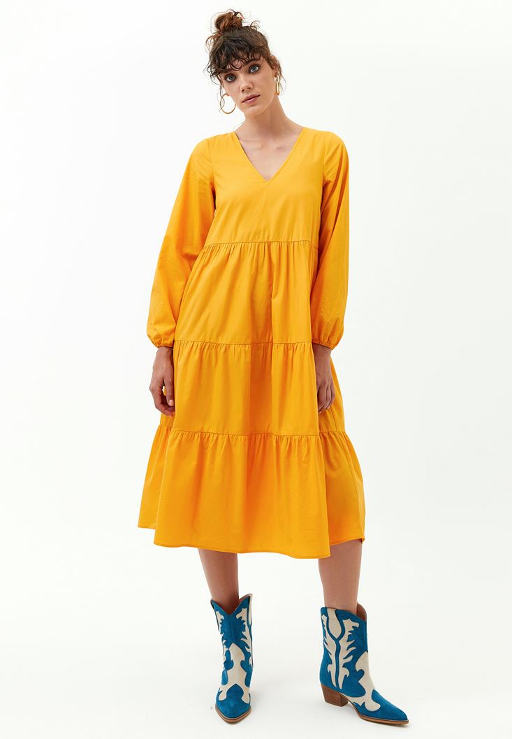• Bayan Turuncu Volanlı V Yaka Uzun Elbise