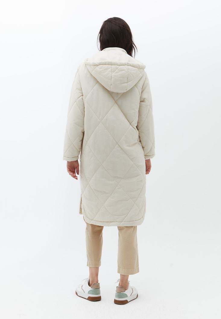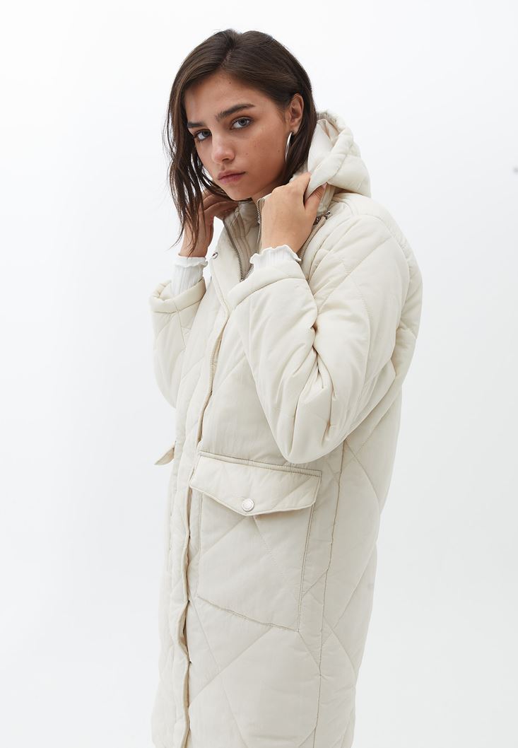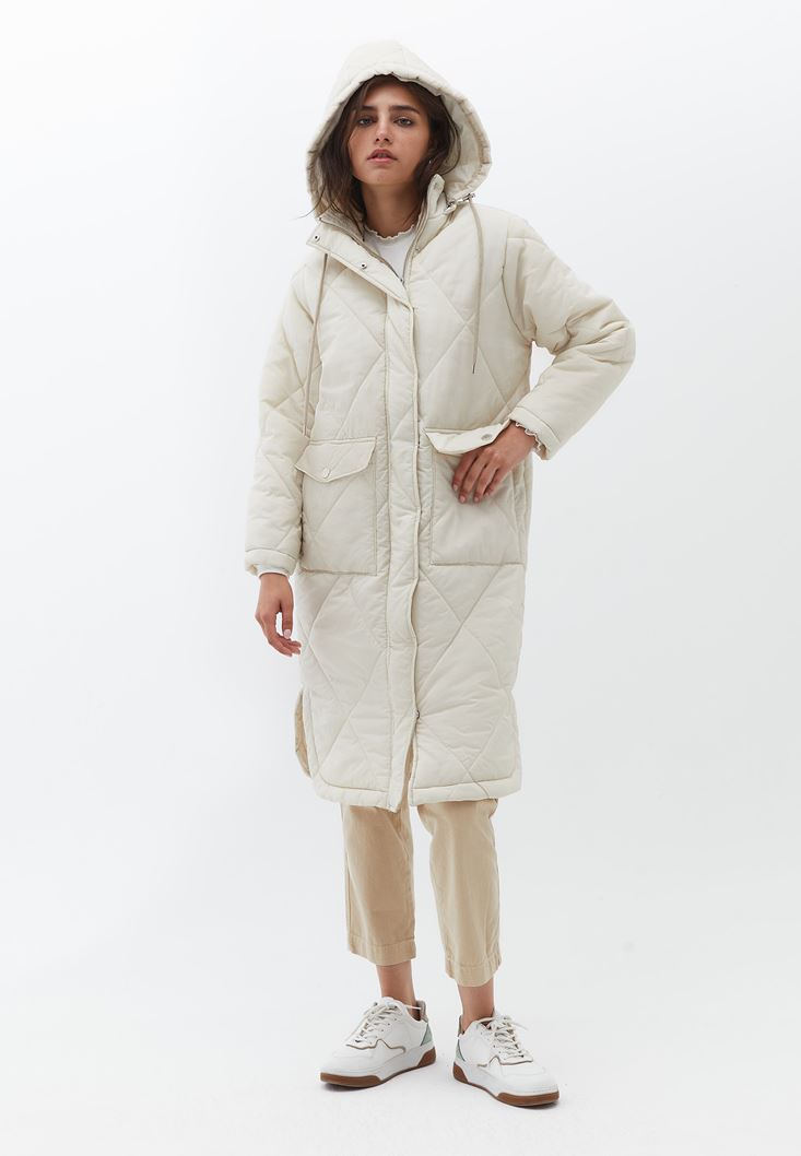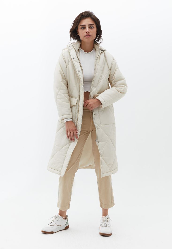 Puf dolgulu kapitone doku, ön kısmı kapaklı ve çıtçıtlı cepli, çıkarılabilir kapüşonlu, çıtçıt ve fermuar kapamalı, uzun boy, bedenden uzak oversize fit, yüksek yaka.