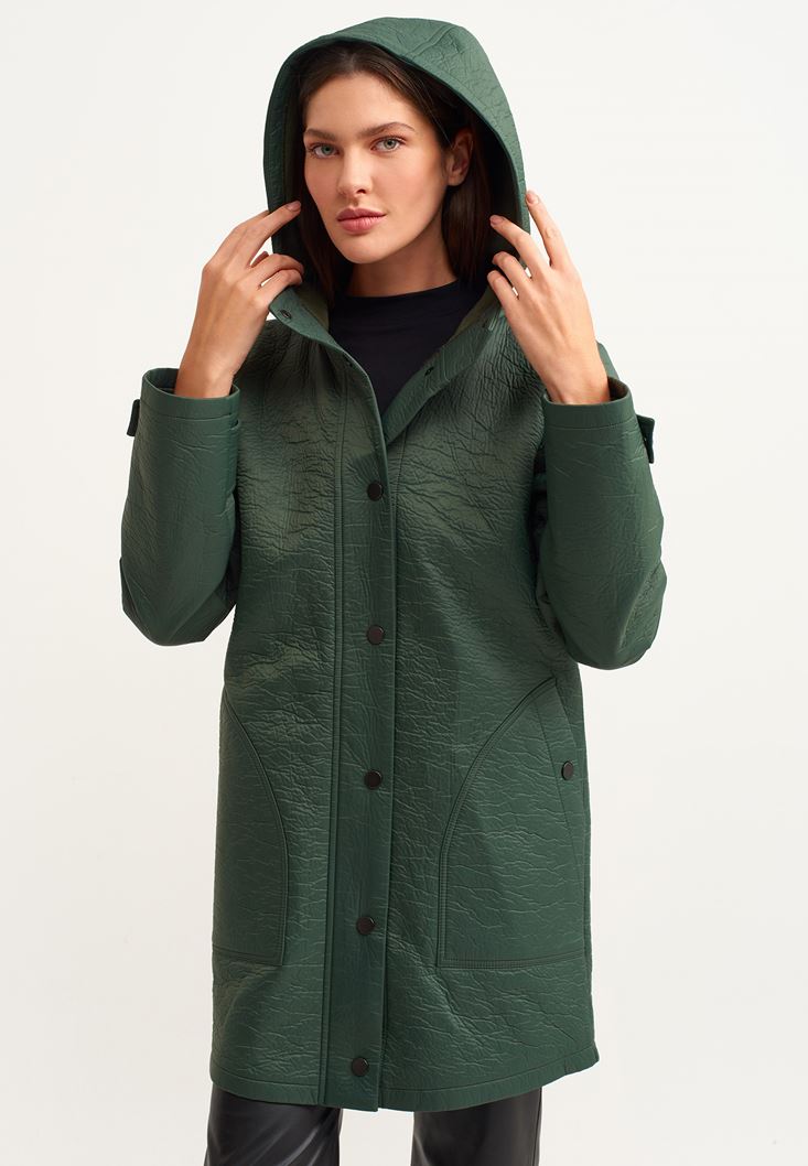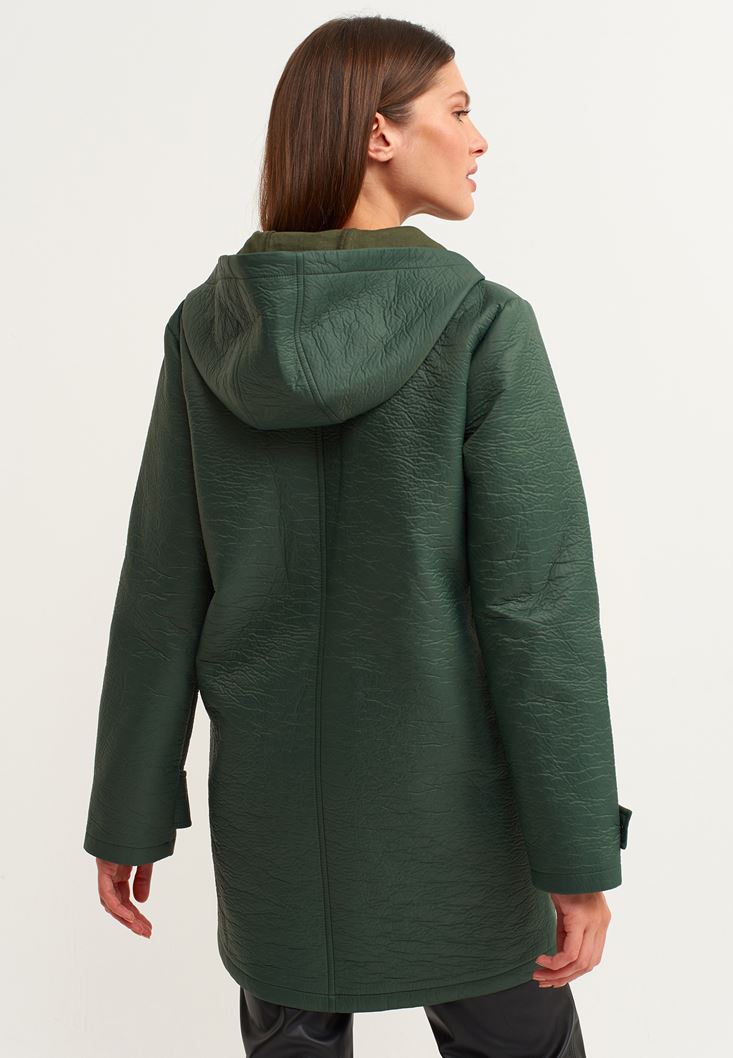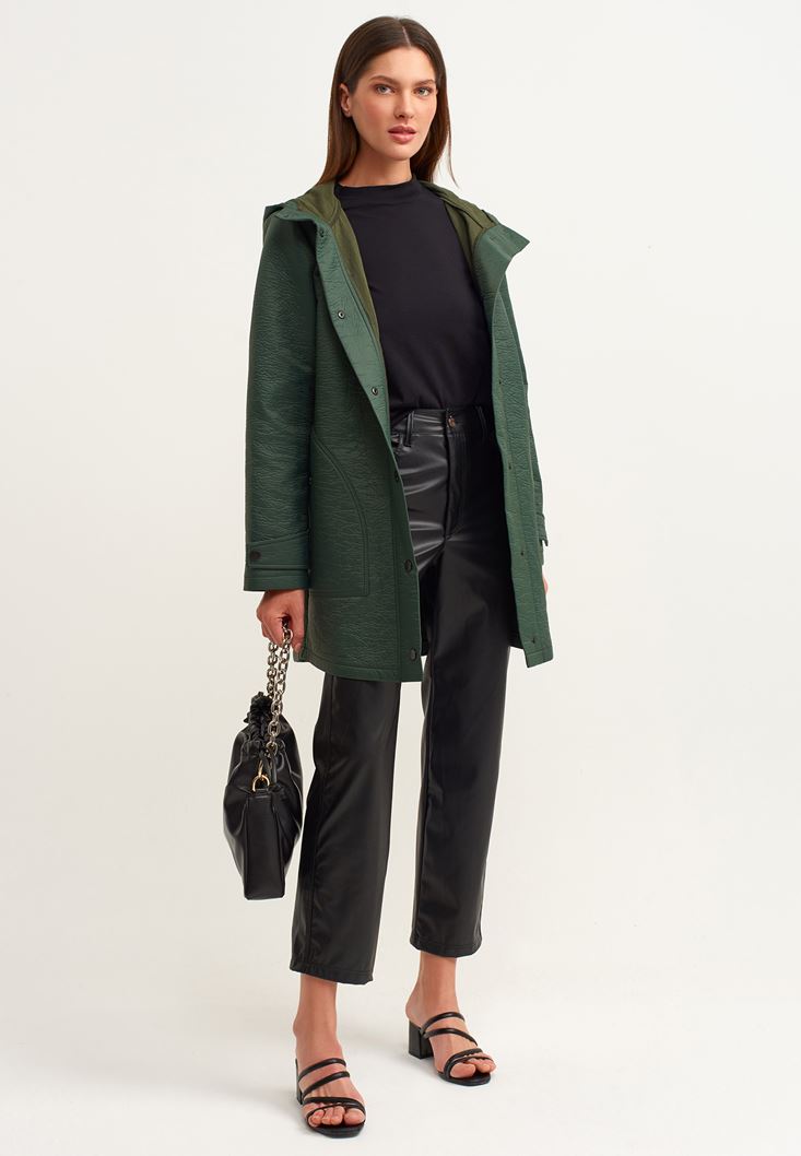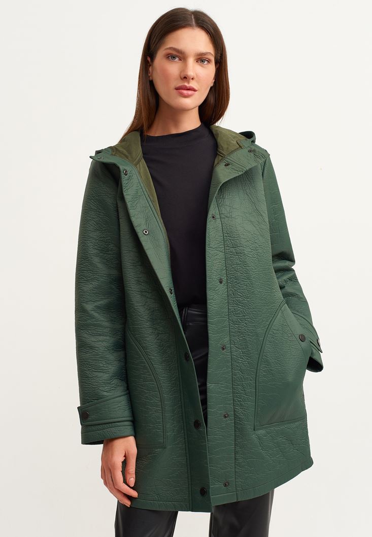 Water-proof özellikli su geçirmeyen doku, oversize rahat kalıp, yüksek yaka, kapüşonlu, önü iki cepli, çıtçıt kapamalı, midi boy.