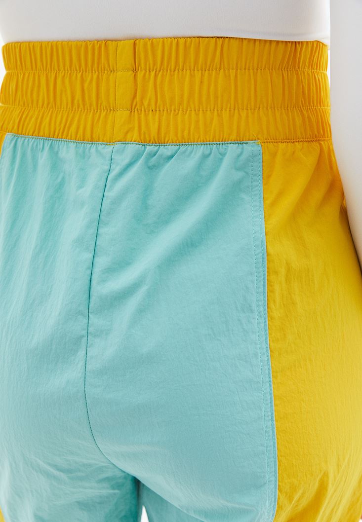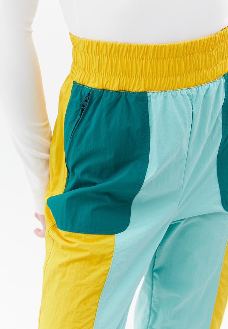 Su geçirmez özel kumaş, ultra yüksek bel, bedenden uzak baggy fit, jogger paça, ön kısmı iki cepli, beli ve paçası lastikli, kontrast renkli tasarım, spor aktiviteleri ve yağmurlu hava koşulları için özel tasarlanmış doku.