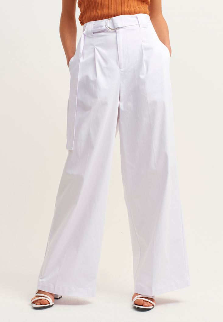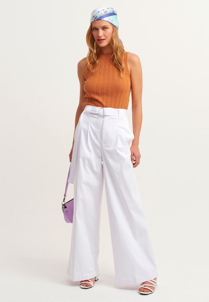 Pamuk karışımlı özel doku, ultra yüksek bel, kendi kumaşından kemerli, iki yanı cepli, ön kısımda iki pile, bedenden uzak rahat kalıp.