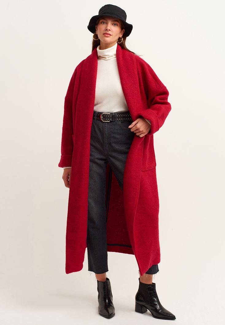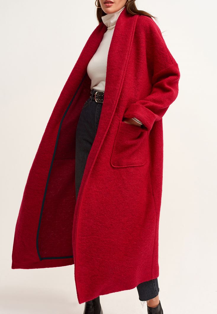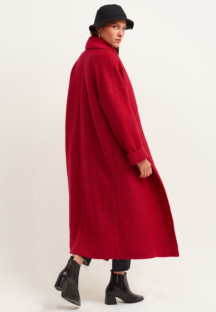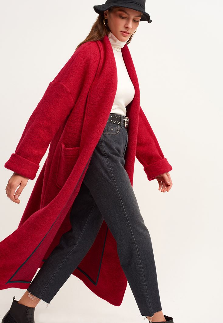 Kırmızı Wool Blend Uzun Cepli Kaban