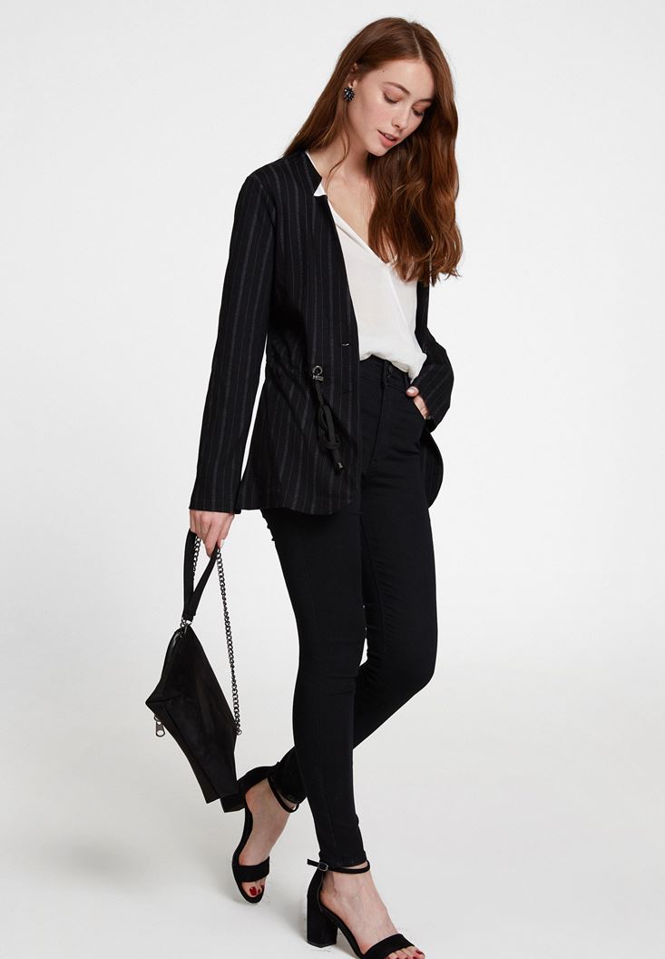 Yaka Detayli Çizgili Ceket modeli modern tasarimi ve klasik tarzi destekleyen durusu ile dolabinizdaki kurtarici ceket modelleri arasinda yer alacak. Tarzinizi ön plana çikarmak, durusunuzu güçlendirmek ve her zaman en iyisine sahip olmak için tercih edebileceginiz tasarimlar arasinda yer alan ceket modeli ile kendinizi her zaman enerjik ve konforlu hissedeceksiniz. Ceket modelinin dokusunda kullanilan viskon lifi sayesinde gün boyu elde edeceginiz konforun tadini çikaracaksiniz. Viskon lifinin nefes alan yapisi, yumusak dokusu ve yüksek nem emiciligi sizi en hareketli günlerinizde bile yalniz birakmayacak tasarimlardan birisi olan ceket modeli bel kesimindeki büzgü detayi, klapasiz yaka kesimi ve dikey çizgileri ile sadelikten gelen gösterisin, OXXO ilhami ile bulusmasini yansitiyor.