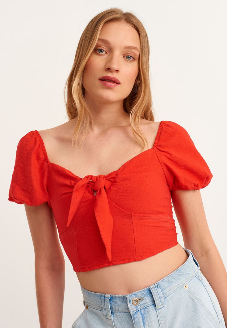 • Bayan Kırmızı Yaka Detaylı Crop Bluz