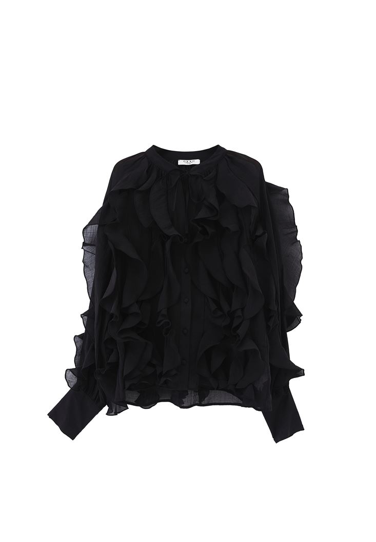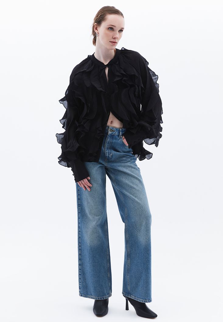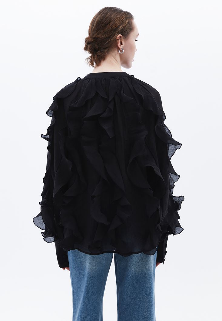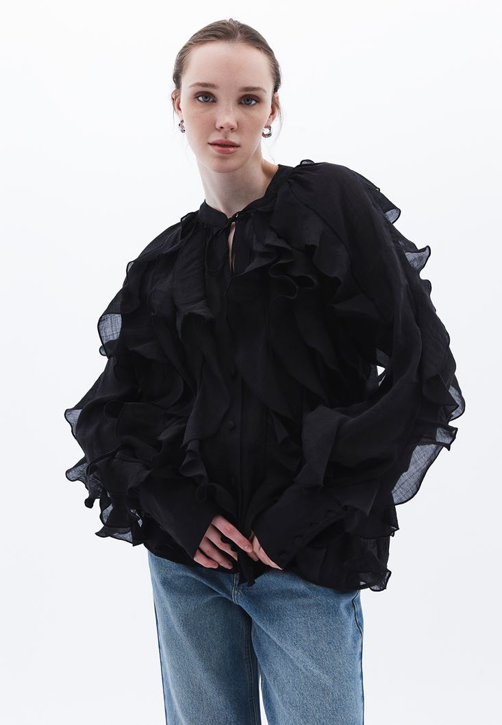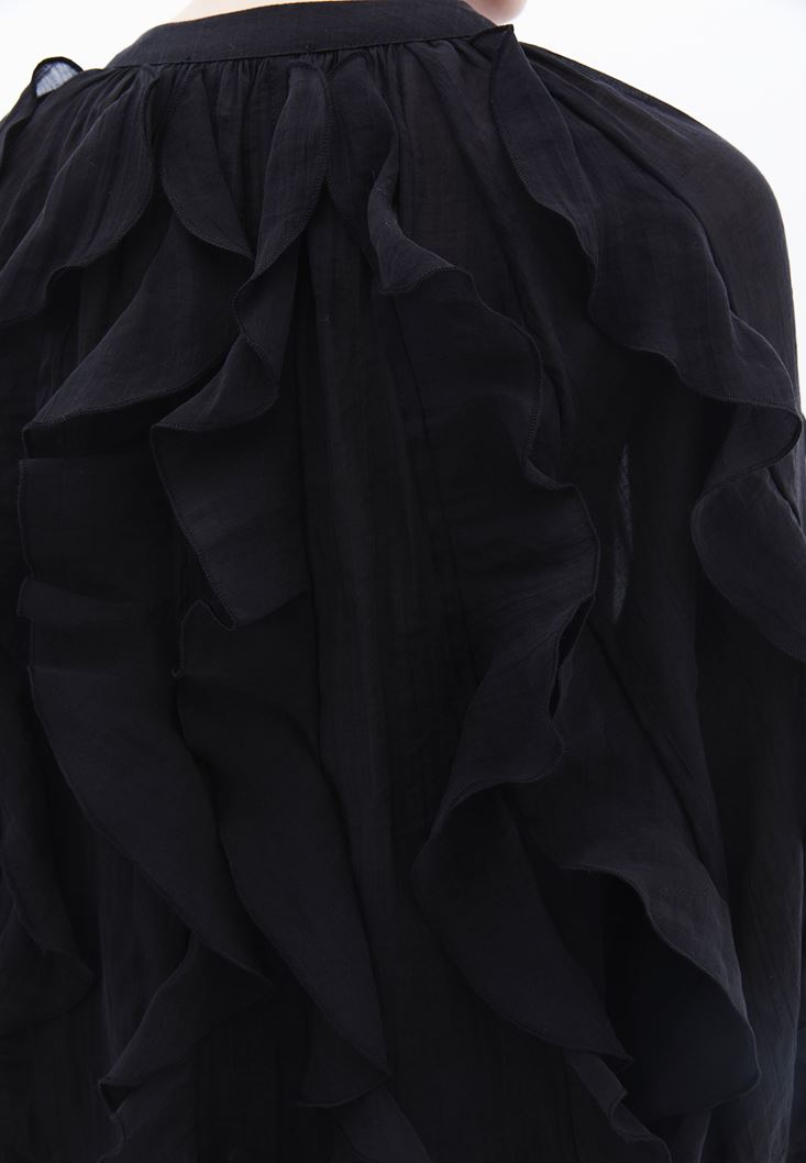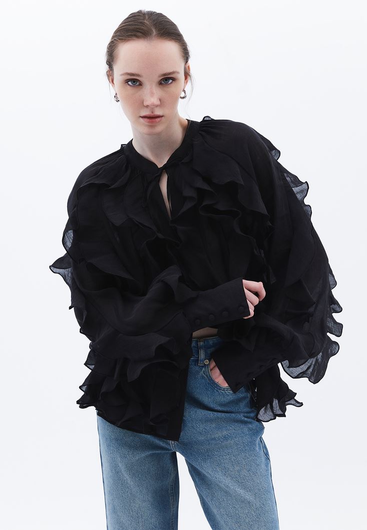 Siyah Yaka Detaylı Fırfırlı Bluz