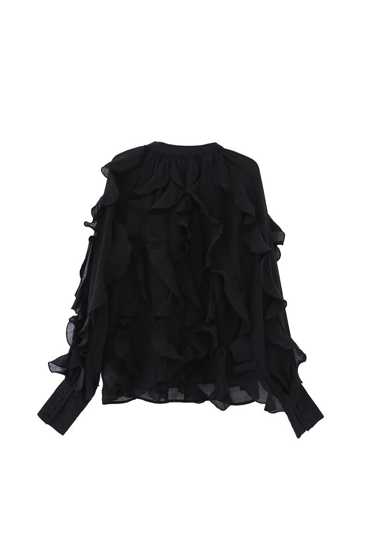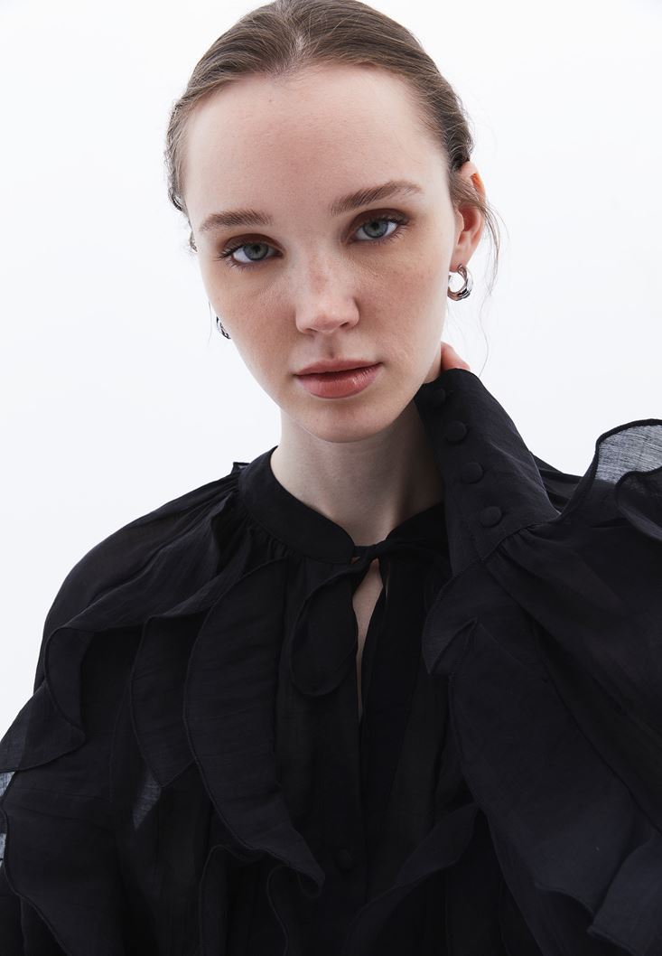 • Bayan Siyah Yaka Detaylı Fırfırlı Bluz