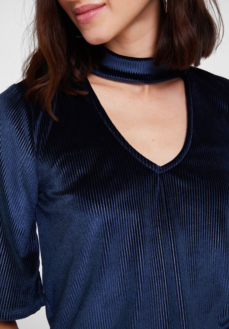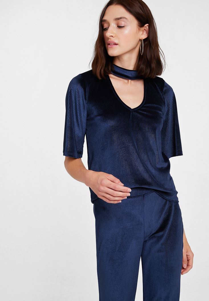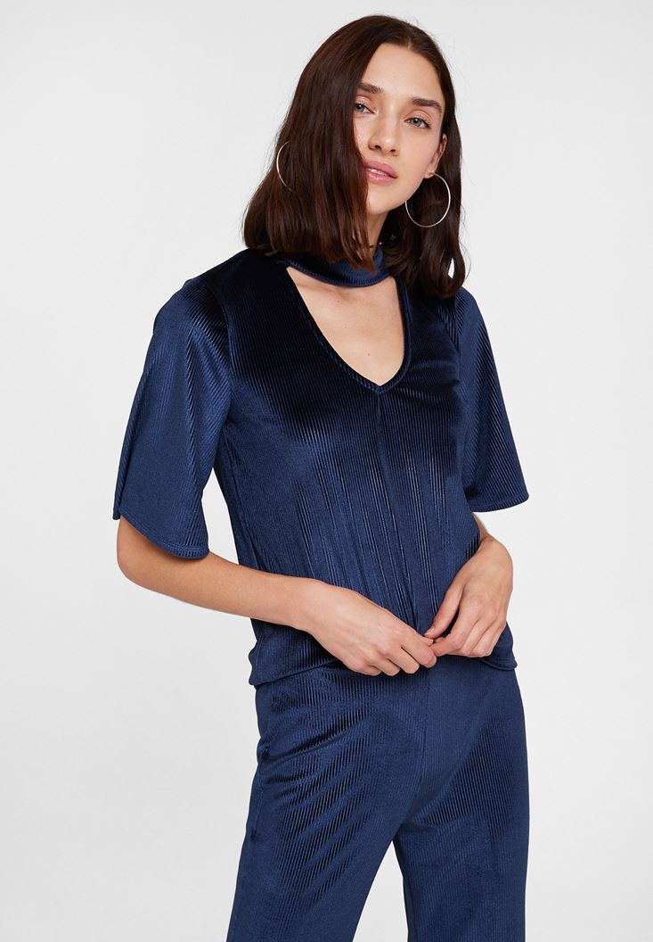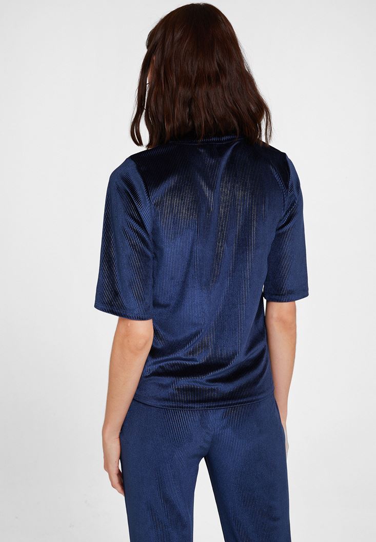 • Bayan Lacivert Yaka Detaylı Kadife Bluz