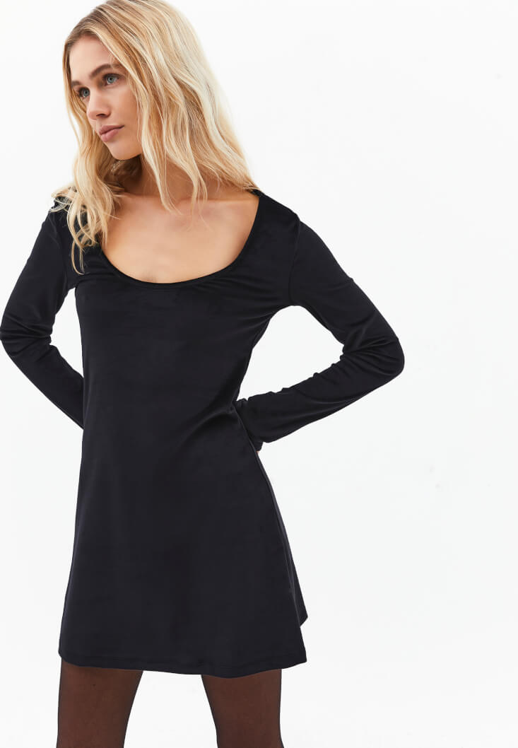 Siyah Yaka Detaylı Kadife Mini Elbise