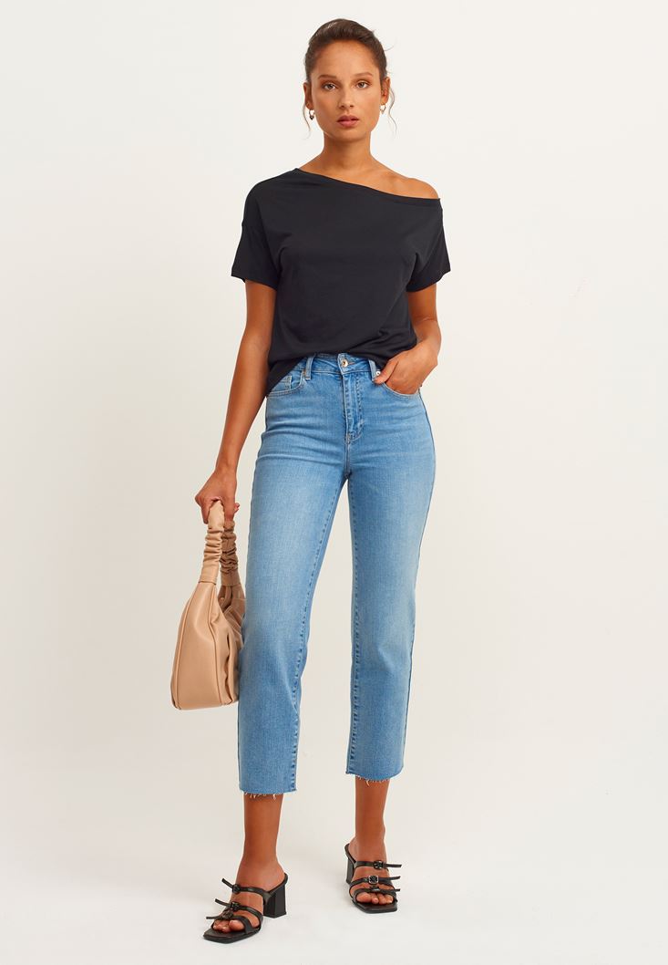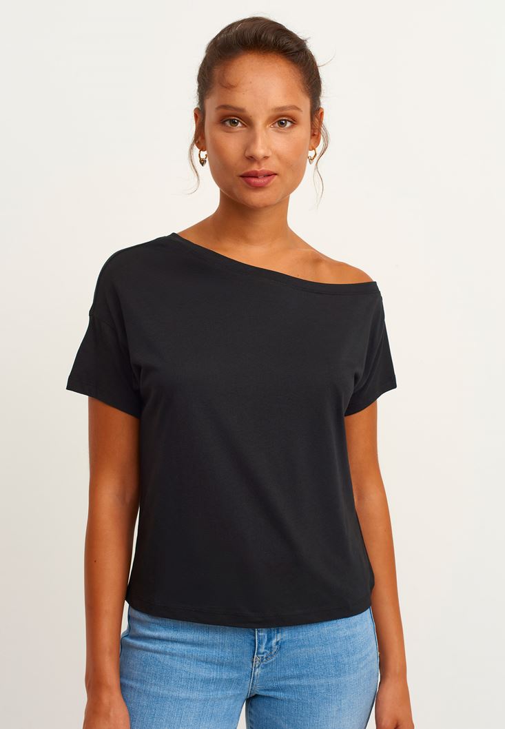 Pamuk ve modal karışımlı doğal doku, bedene yakın rahat kalıp, düşük omuz tasarımlı, kısa kollu, standart boy.