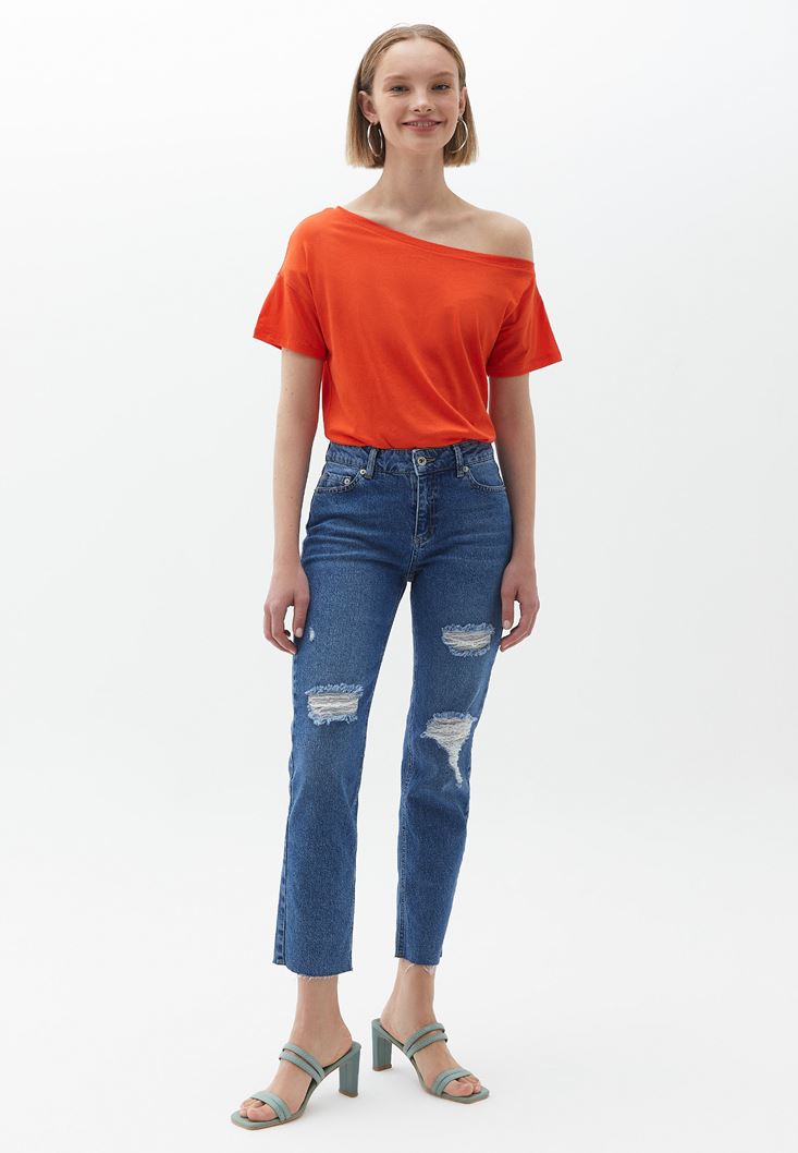 Pamuk ve modal karışımlı doğal doku, bedene yakın rahat kalıp, düşük omuz tasarımlı, kısa kollu, standart boy.