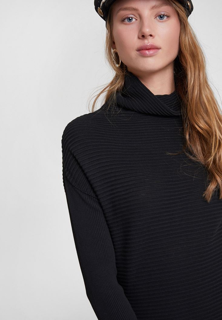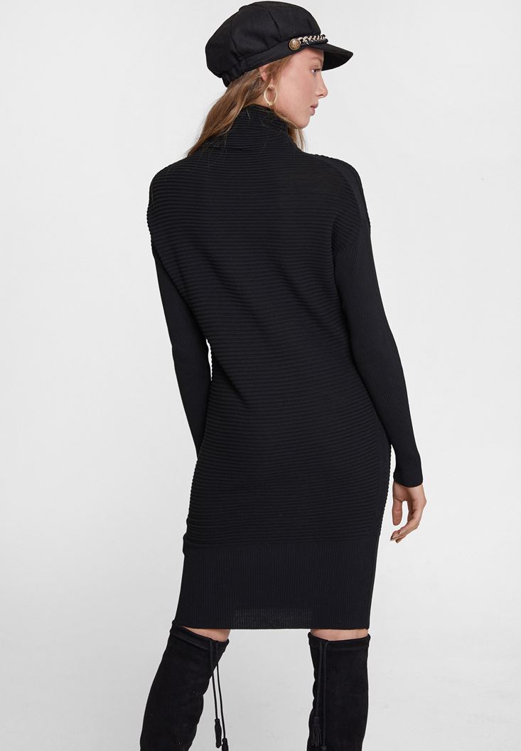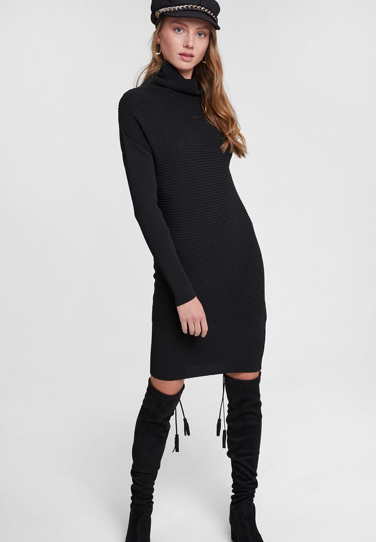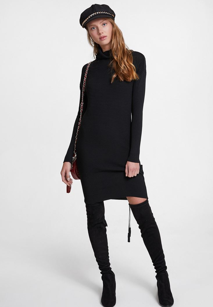 • Bayan Siyah Yaka Detaylı Triko Elbise