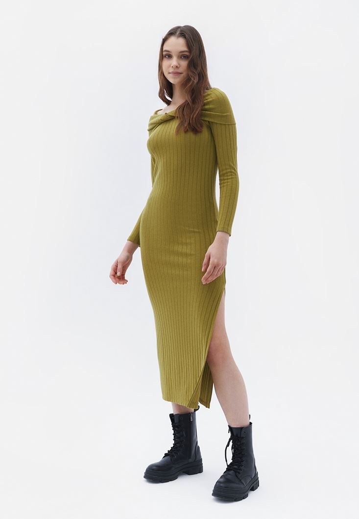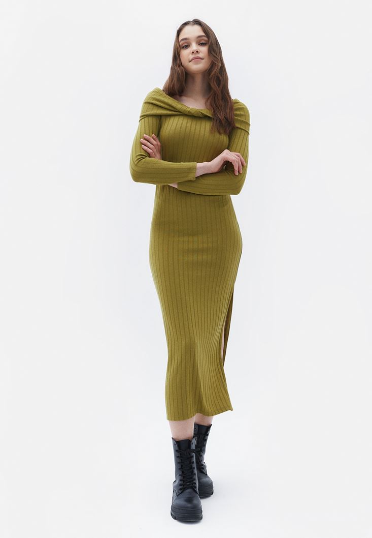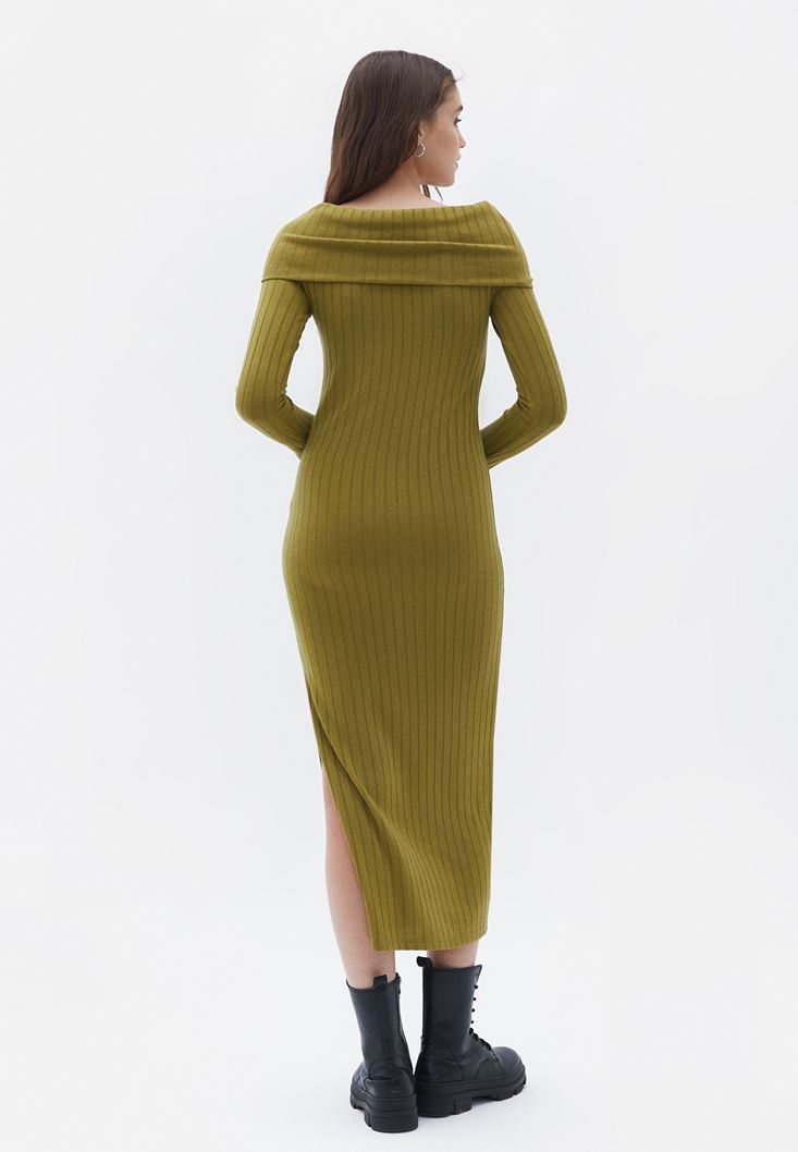 Yeşil Yaka Detaylı Triko Elbise
