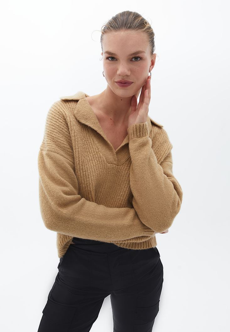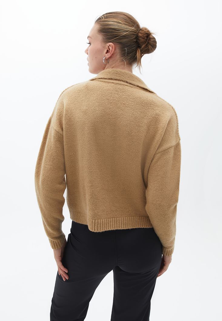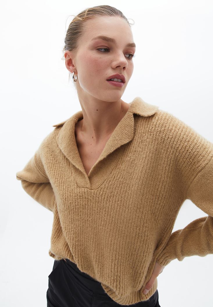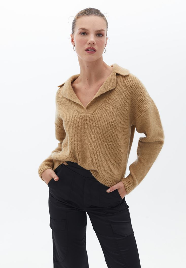 • Bayan Bej Yaka Detaylı Triko Kazak