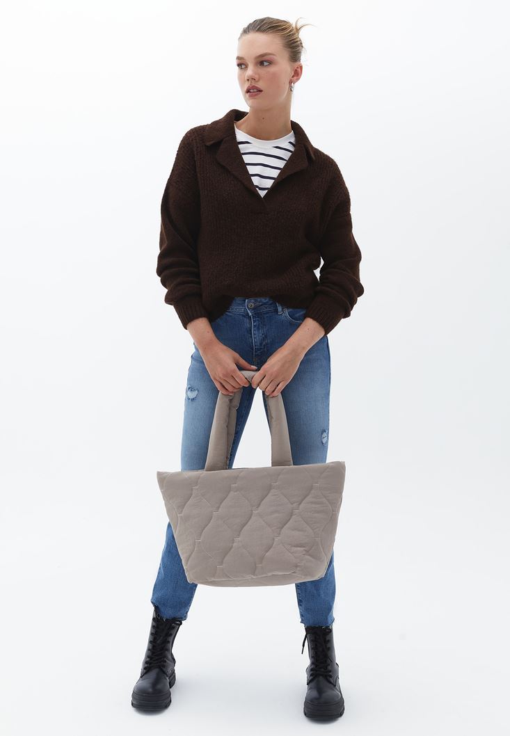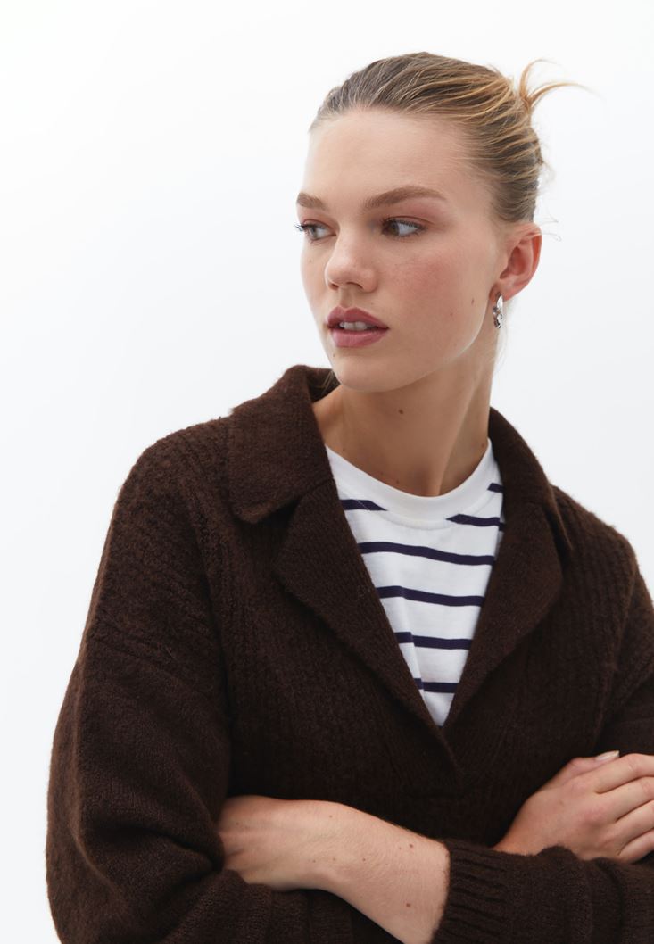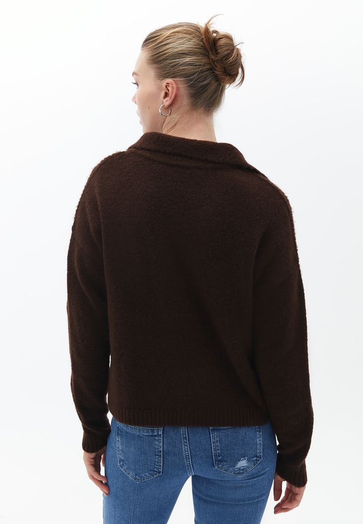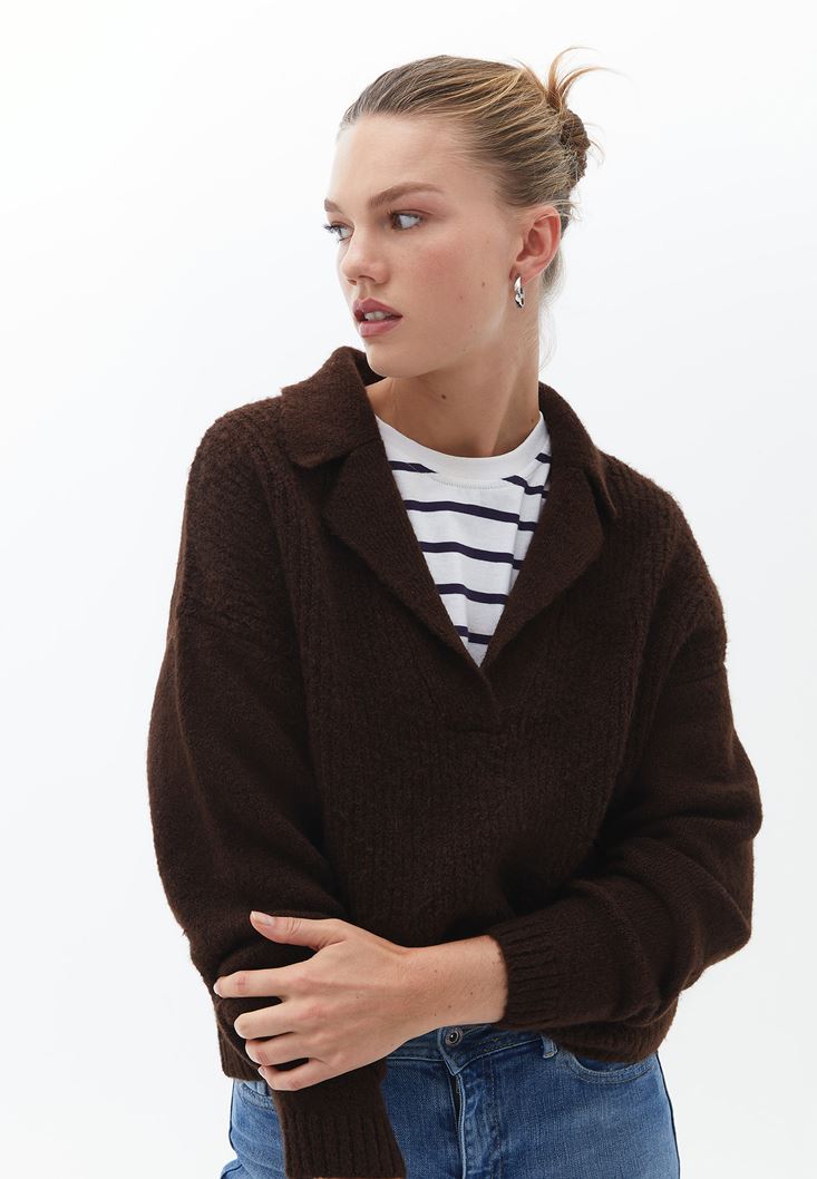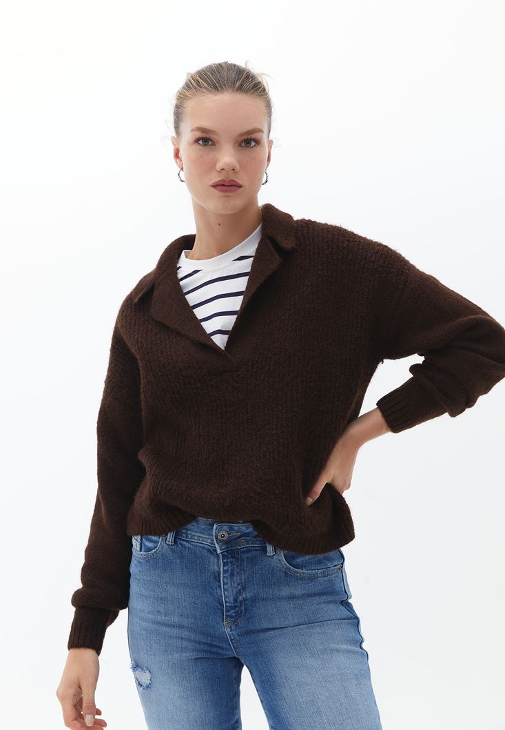 Kahverengi Yaka Detaylı Triko Kazak