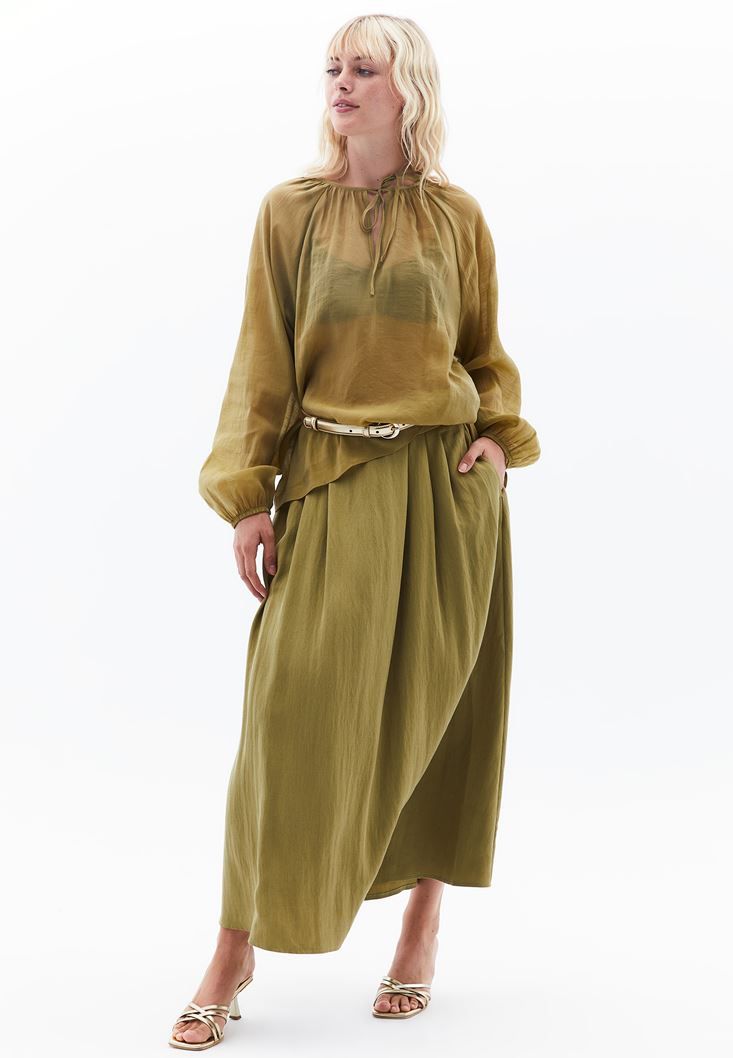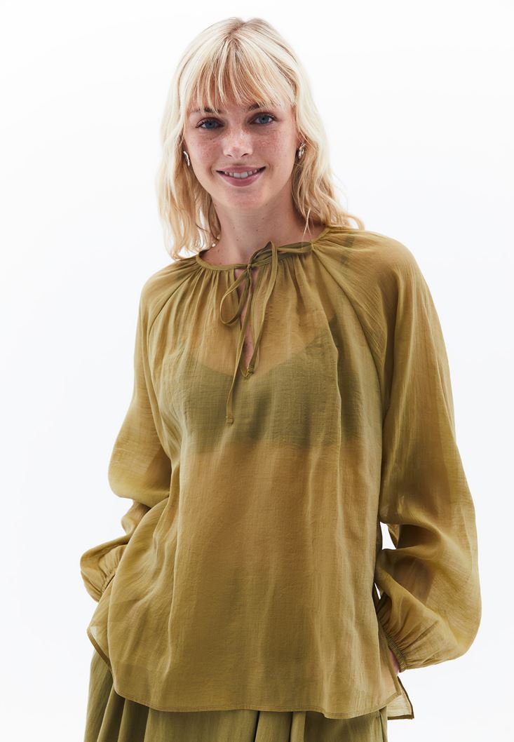 Tencel(Lyocell) içerikli doku, bedenden uzak loose fit, uzun kollu, yakası bağcıklı, kol ucu lastikli.
