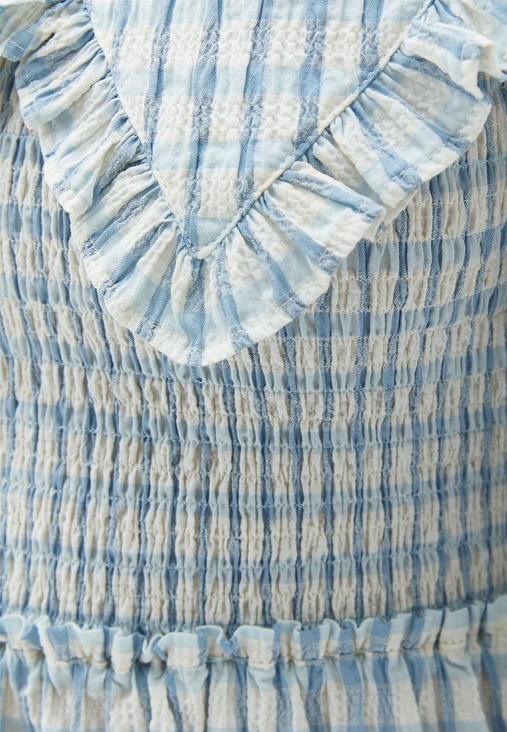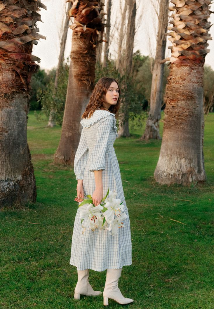 Pamuk karışımlı özel doku, desenli kumaş, fırfırlı yaka detayı, balon kollu, üst bedeni gipeli, kol ucu büzgülü, uzun boy.