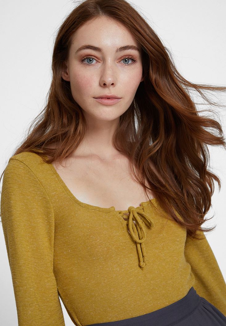 Yakasi Baglamali Uzun Kol Detayli Bluz modeli dökümlü kesimi, serin tutan dokusu ve zarif detaylari ile siklik seviyesini farkli bir noktaya tasiyan bluz modelleri arasinda yer aliyor. Kare yaka kesime sahip olan bluz modeli hem klasik hem de spor tarzda kombinlerde tercih edebileceginiz kullanisli parçalardan birisi. Bluz modelinin yaka kesiminde kullanilan baglama detaylari tasarima enerji kazandiriyor. Bilezik kesim kollar tasarimin enerjisini destekleyerek hareketliligi ön plana çikariyor. Keten dokunun serin tutma özelligi sayesinde oldukça konforlu bir kullanim sunan bluz modeli bu doku sayesinde gün boyu özgür hissetmenize yardimci oluyor. OXXO’nun dokulardan aldigi ilhami zarafet ile bulusturdugu parçalardan birisi olan bluz modeli ile kendinize her zaman hos kombinler yapacaksiniz.