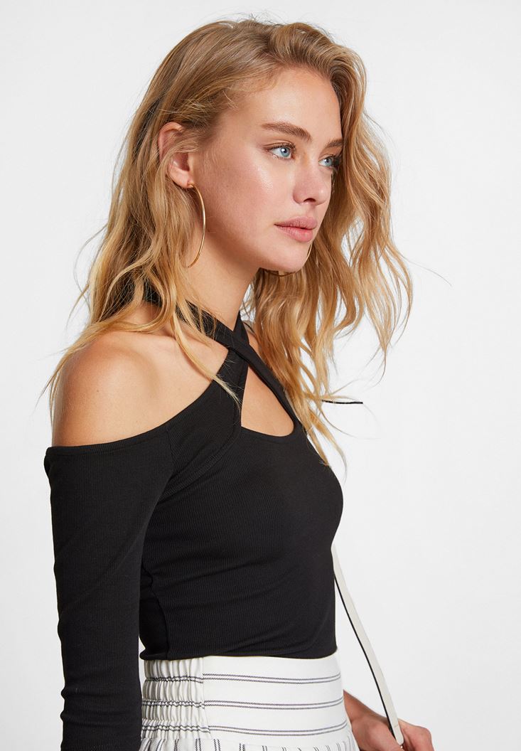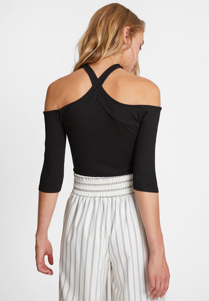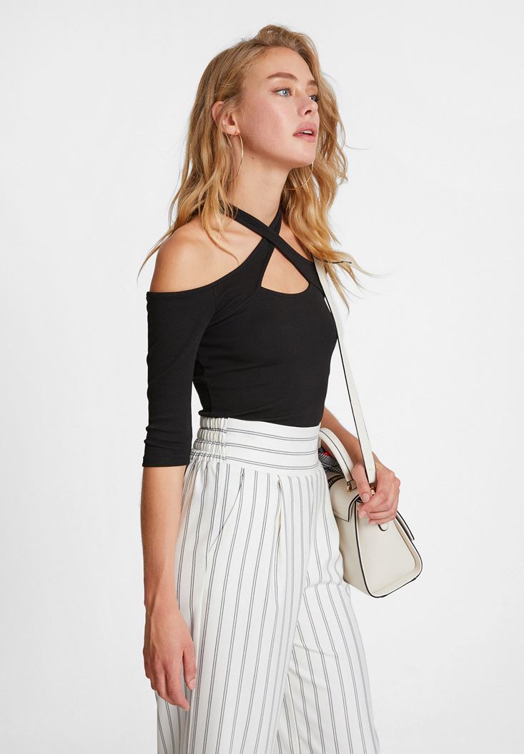 Siyah Yakası Çapraz Biye Detaylı Bluz