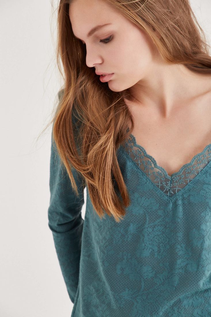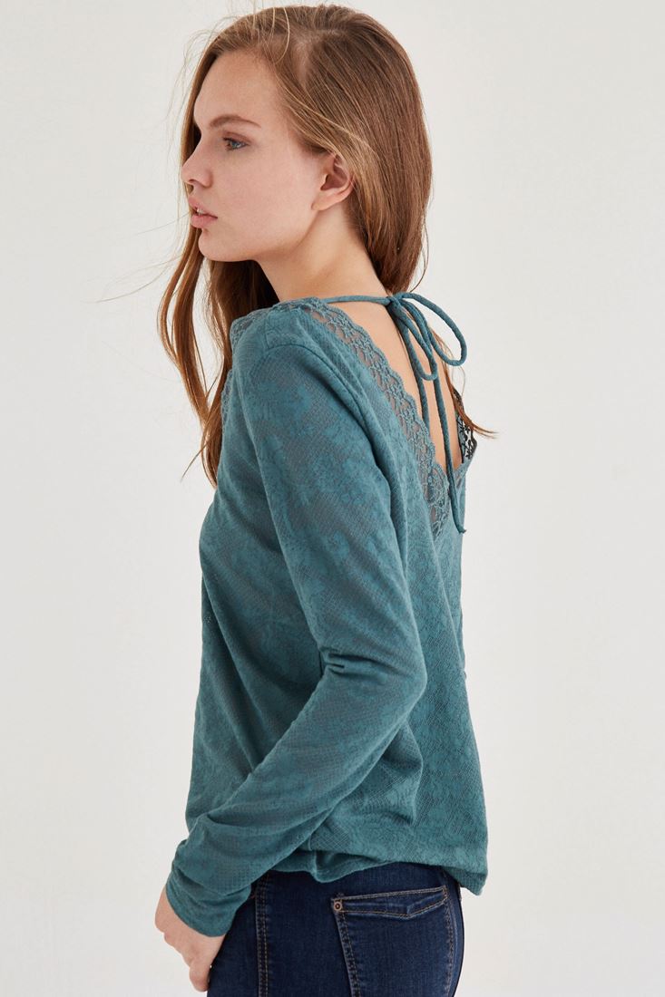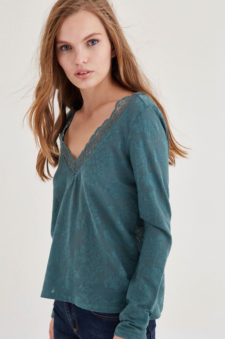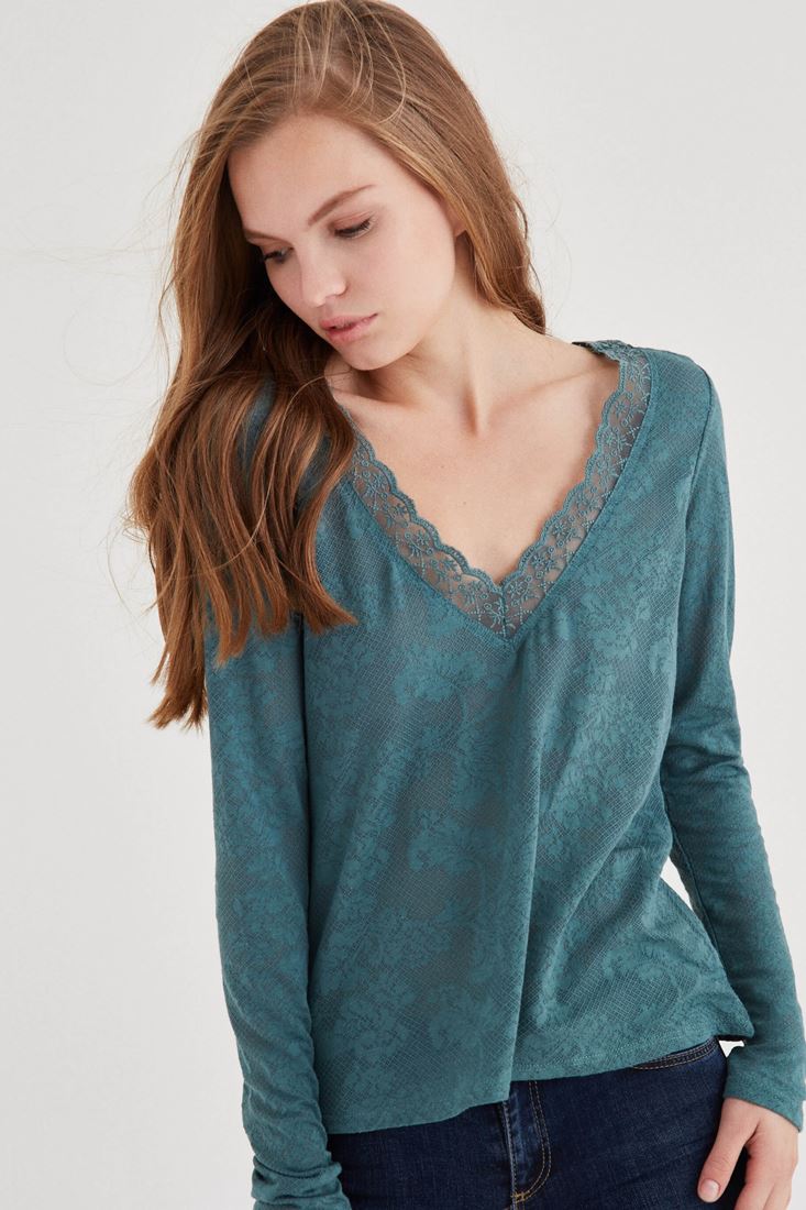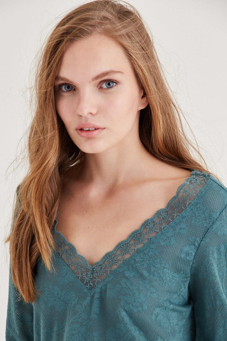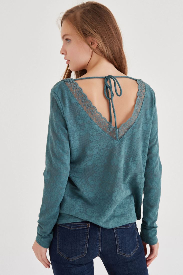 Yeşil Yakası Dantel Detaylı Bluz