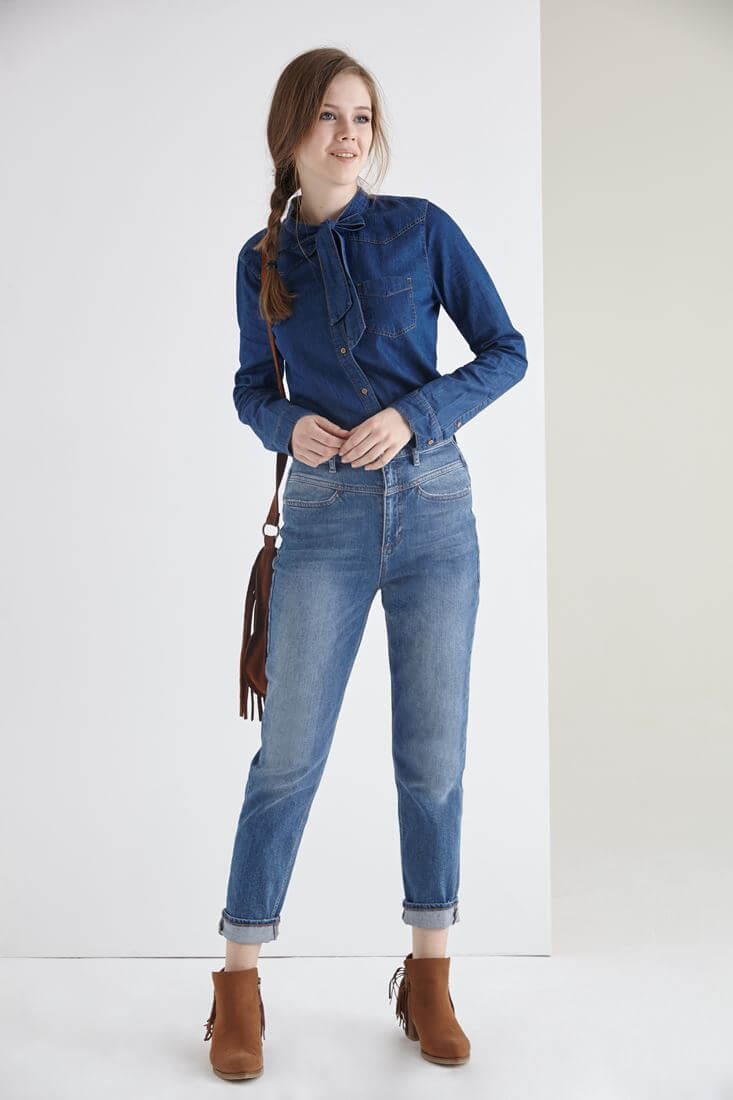 • Bayan Mavi Yakası Fiyonk Detaylı Kot Gömlek