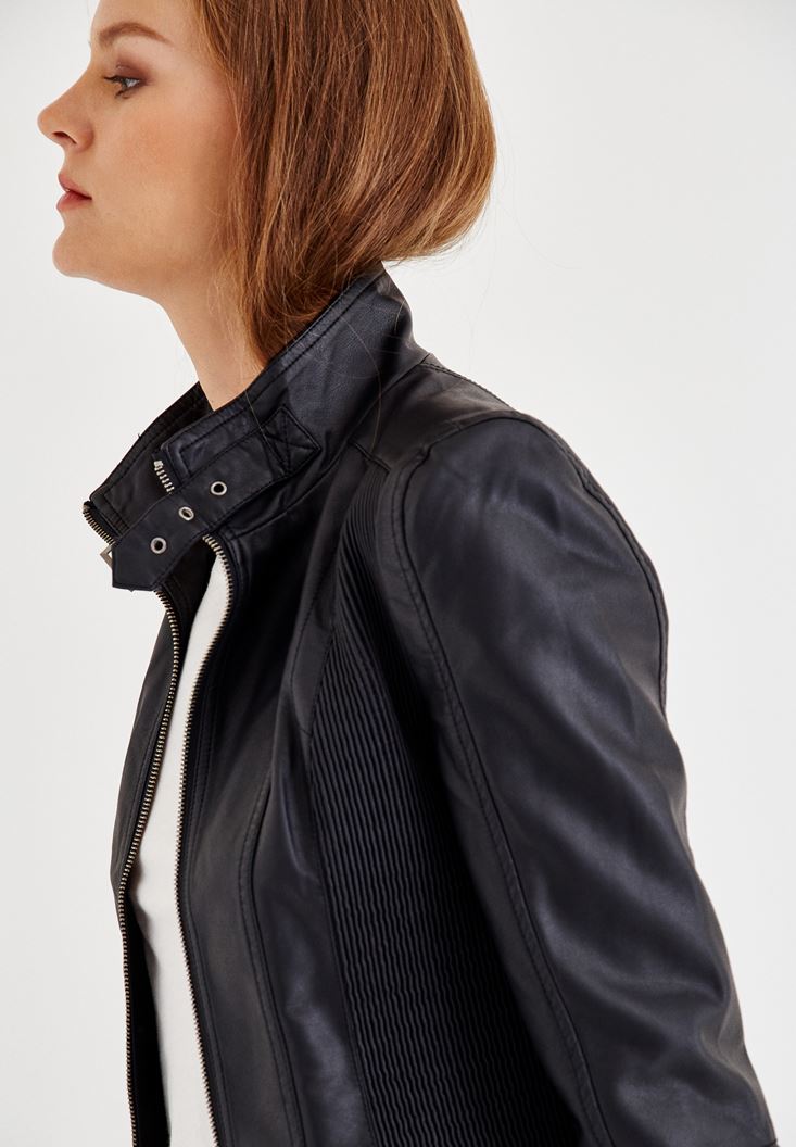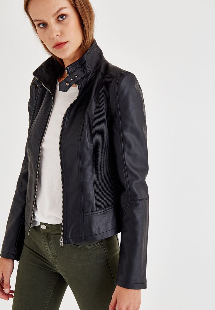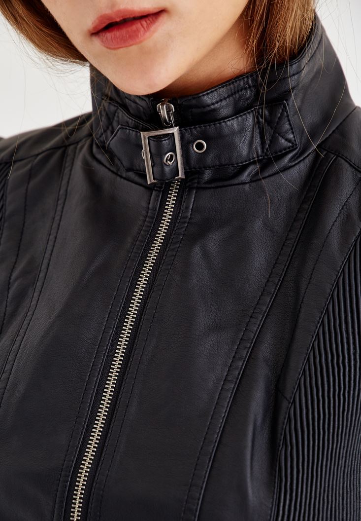 Siyah Yakası Kemer Detaylı Biker Deri Ceket
