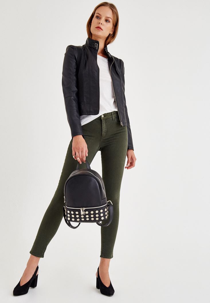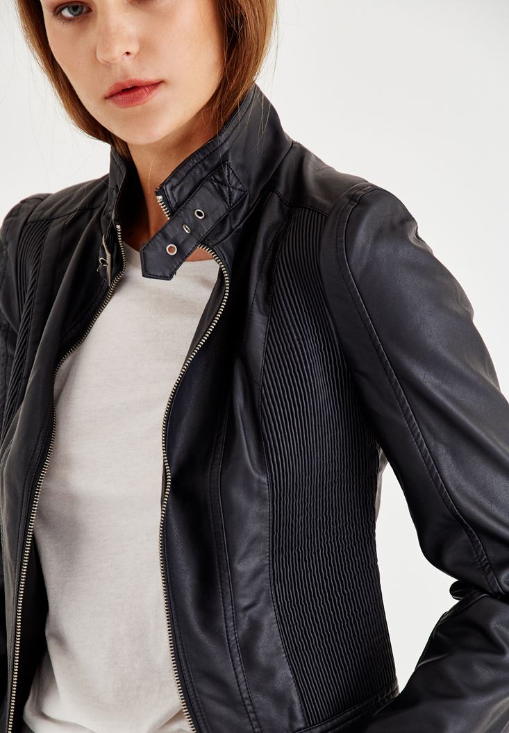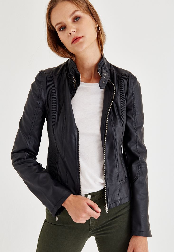 • Bayan Siyah Yakası Kemer Detaylı Biker Deri Ceket