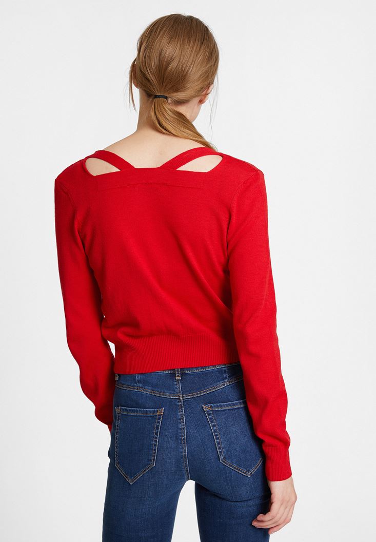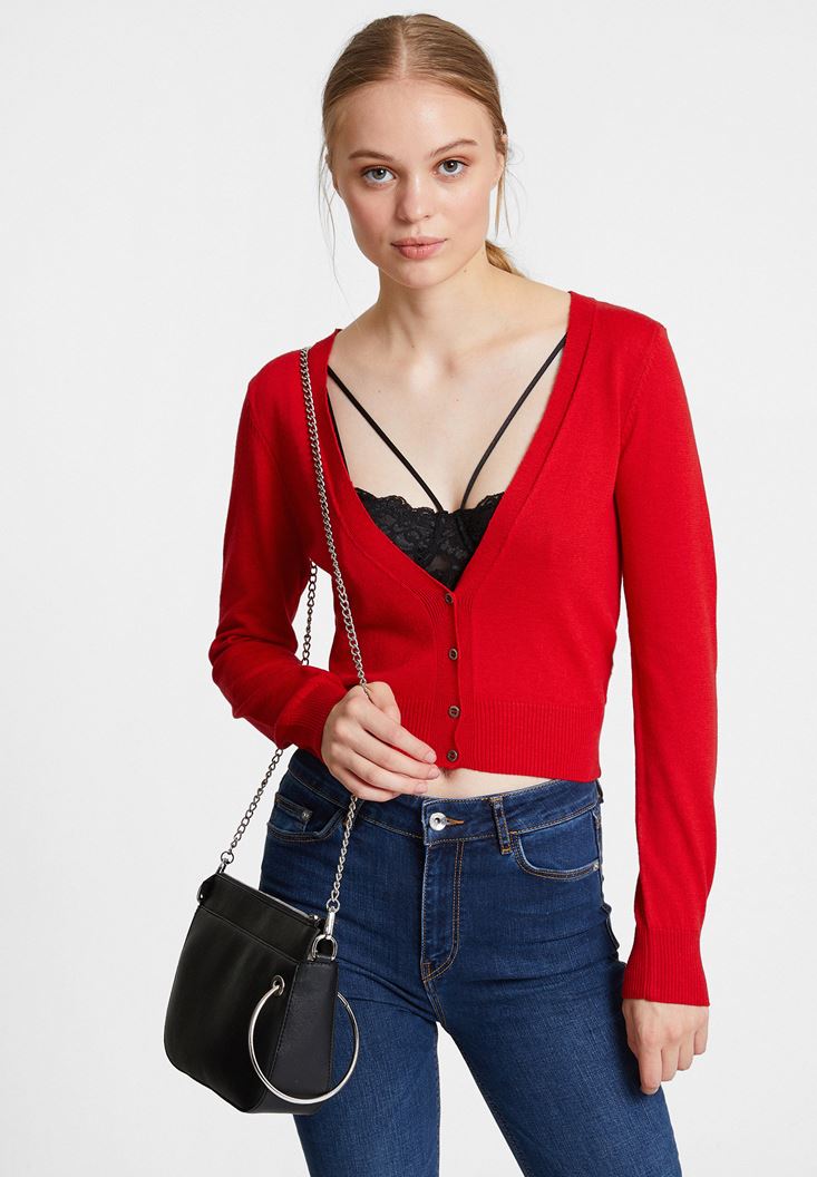 Kırmızı Yakası Kesik Detaylı Kısa Hırka