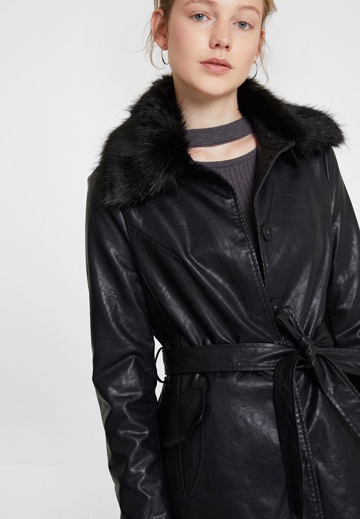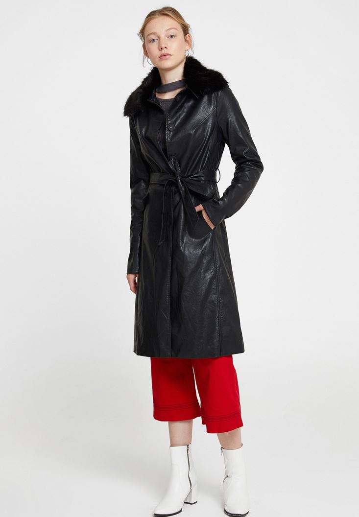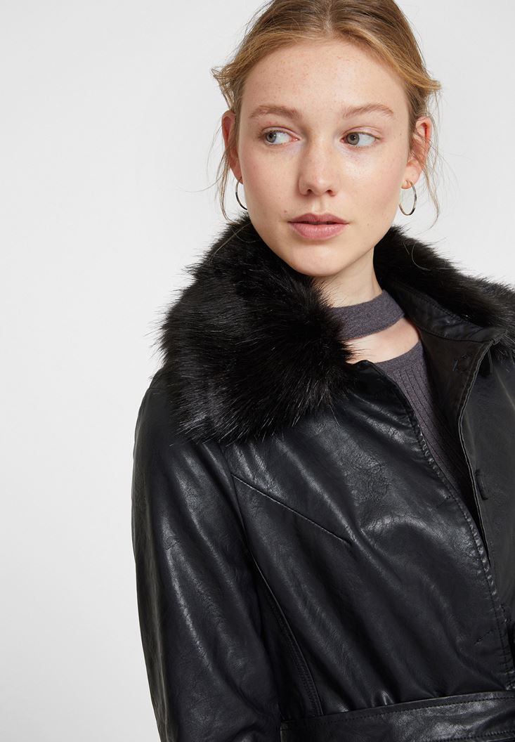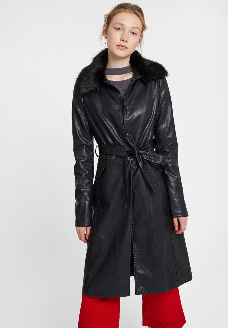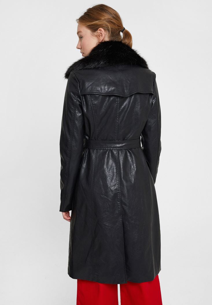 Siyah Yakası Kürk Detaylı Uzun Deri Mont