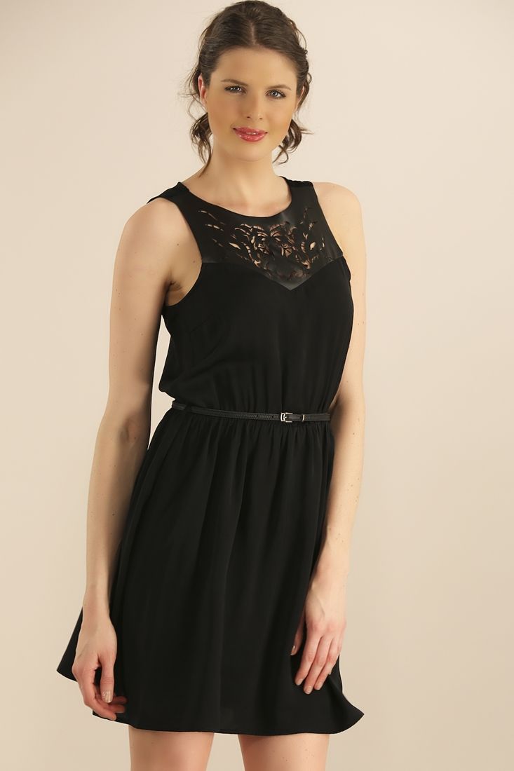 ÖZELLIKLERI; Yaka kismi suni deriye lazer kesimle kaplan figürü olusturulmus saten elbise ÜRÜN IÇERIGI; %100 Polyester ÜRÜN IÇERIGI; %100 Polyester YIKAMA TALIMATI; 30 derecede makinada benzer renklerle yikayiniz. Agartici kullanmayiniz.Sererek kurutunuz.Ilik ütüleyiniz.