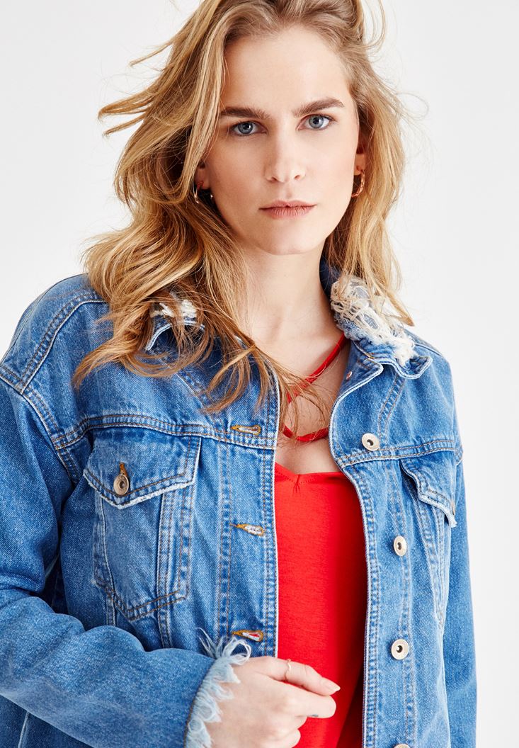 Yakasi yirtik detayli jean ceket sahip oldugu sik görünüm ile kombinlerinizi etkileyici bir sekilde tamamlamayi basariyor. Dilerseniz basic bir tisört modeli ile dilerseniz iddiali bir bluz ile birlikte rahatlikla kullanabileceginiz jean ceket, kisa sürede dolabinizdaki kurtarici parçalar arasinda yer alacak. Her rengi ve deseni basarili bir sekilde tasiyabildigi için oldukça popüler olan jean ceket modelleri, OXXO'nun kendine özgü tarzi ile sikligin yani sira konforu ve hareket özgürlügünü de ön plana çikaran özel tasarimlara dönüsüyor. Jean ceket modelinin yaka kisminda bulunan yirtik detaylar tasarimin kol ve bel kesiminde de yer alarak bütünlük sagliyor. Yaka altinda bulunan iki adet dügmeli cep ise klasik jean ceket tasariminin olmazsa olmazlarindan birisi olarak bu modelde de yer aliyor.