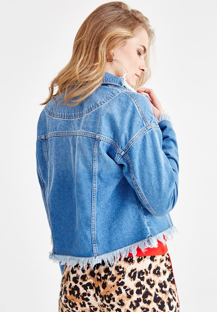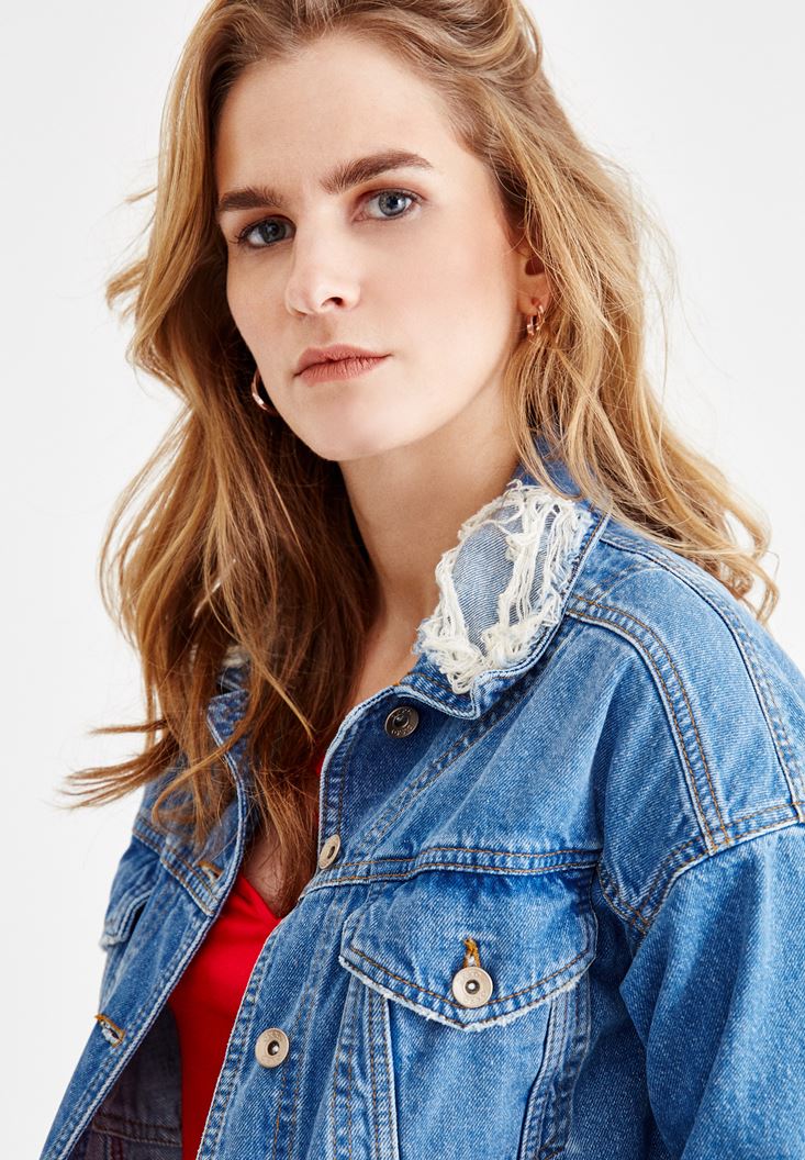 • Bayan Mavi Yakası Yırtık Detaylı Jean Ceket