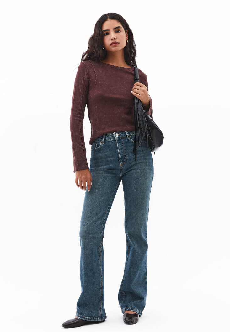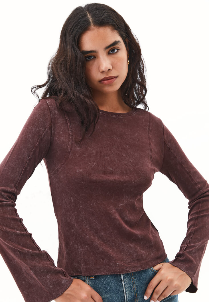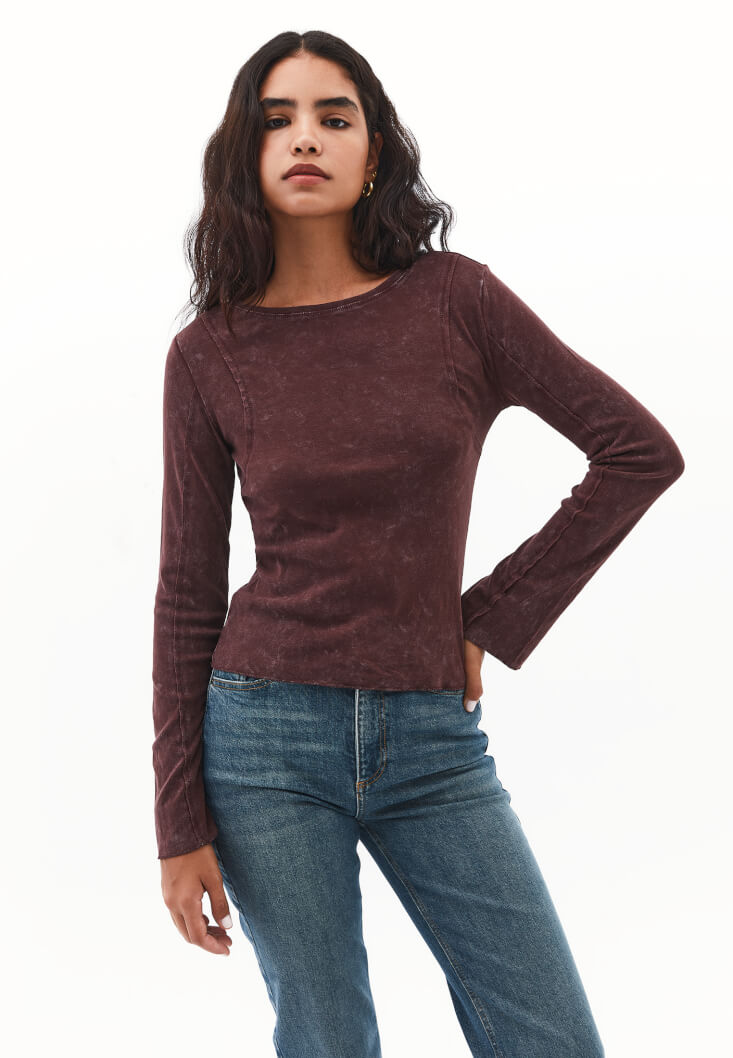 • Bayan Kahverengi Yıkamalı Bot Yaka Tişört