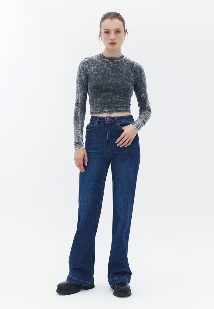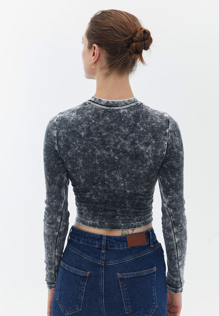 Pamuk içerikli doku, yıkamalı görünüm, bedeni saran esnek fit, uzun kollu, sıfır yaka, crop kesim.