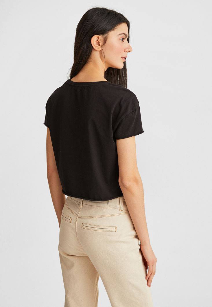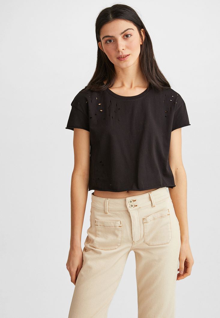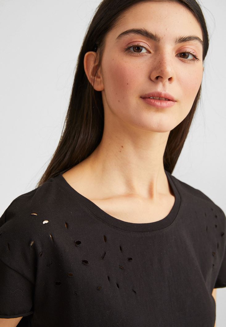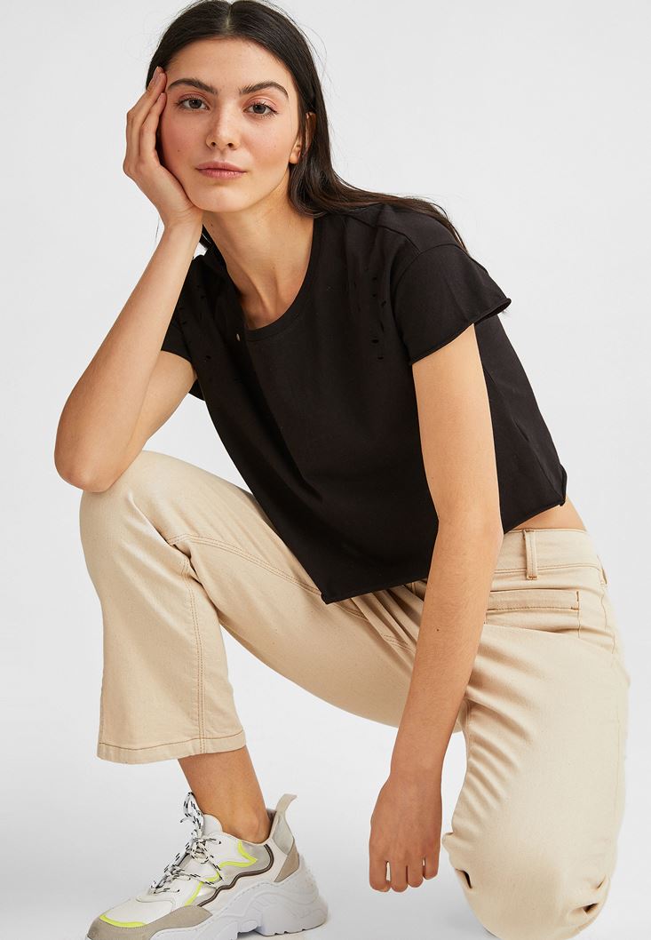 • Bayan Siyah Yırtık Detaylı Kısa Tişört