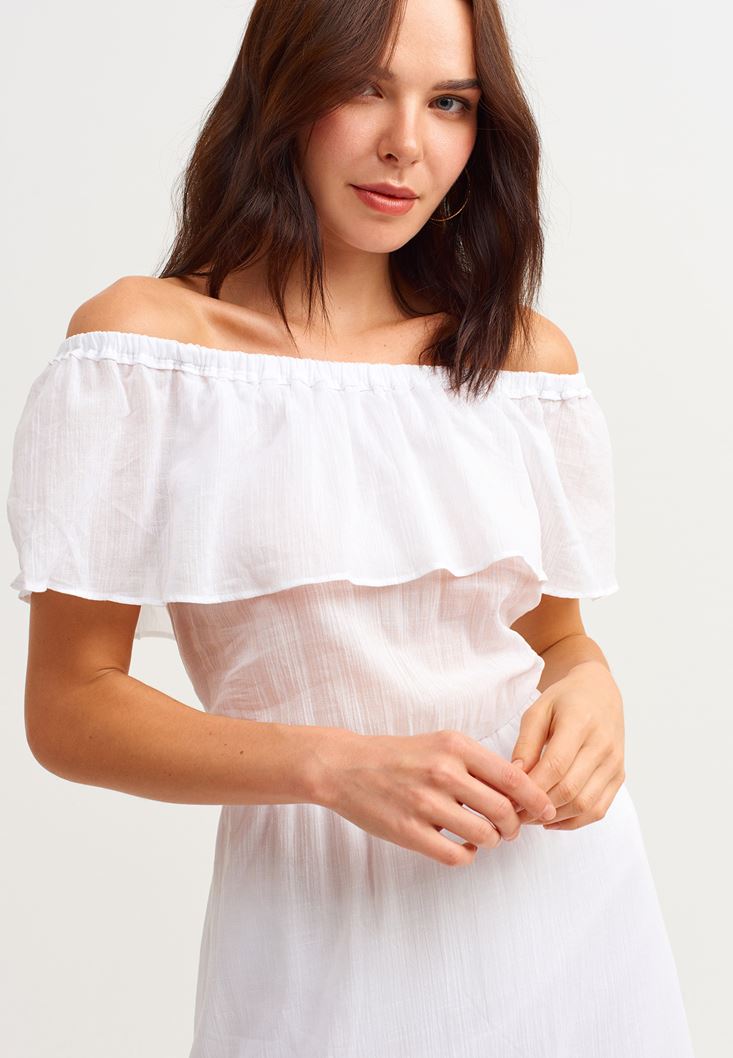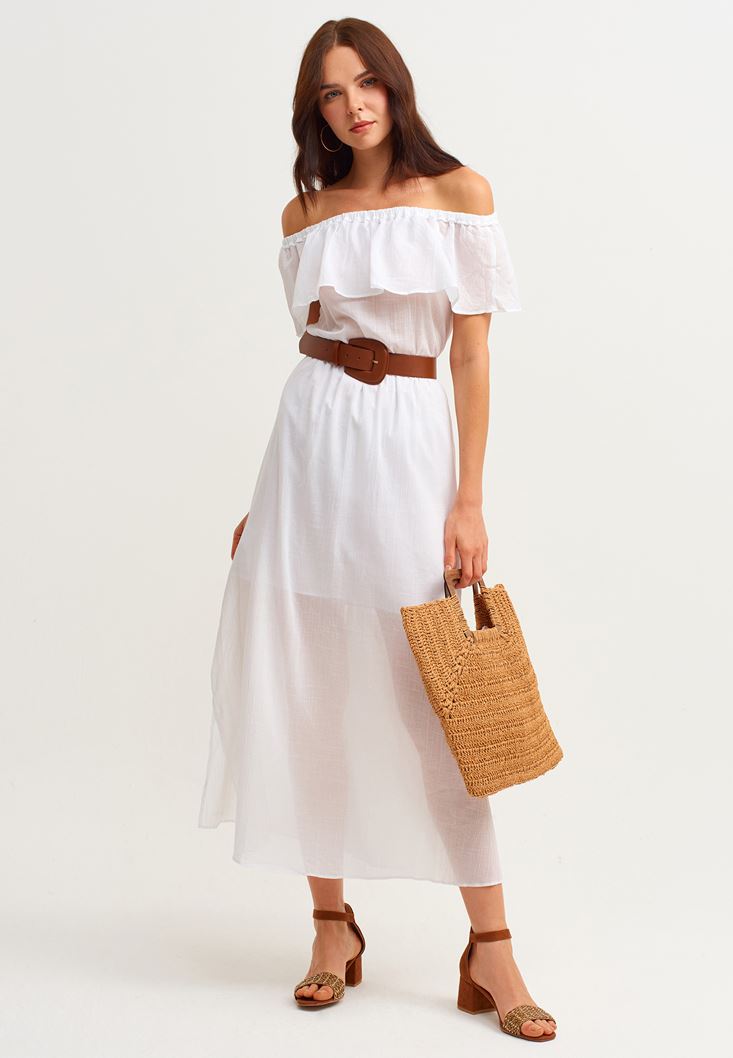 • Bayan Beyaz Yırtmaç Detaylı Uzun Elbise