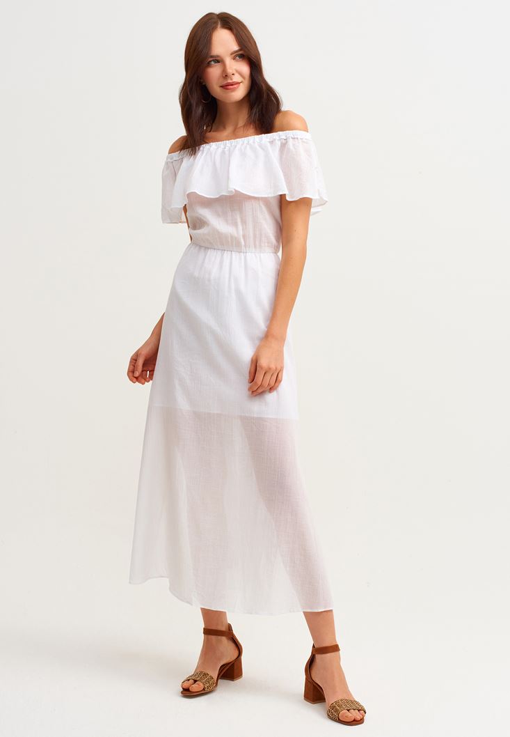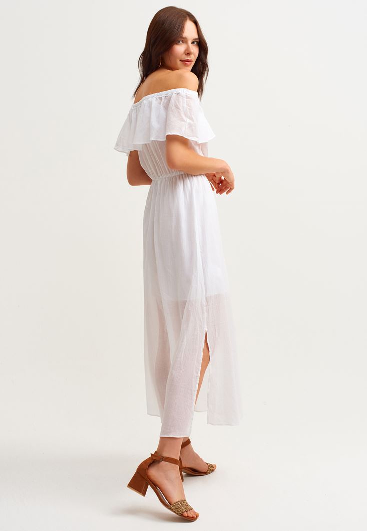 Beyaz Yırtmaç Detaylı Uzun Elbise
