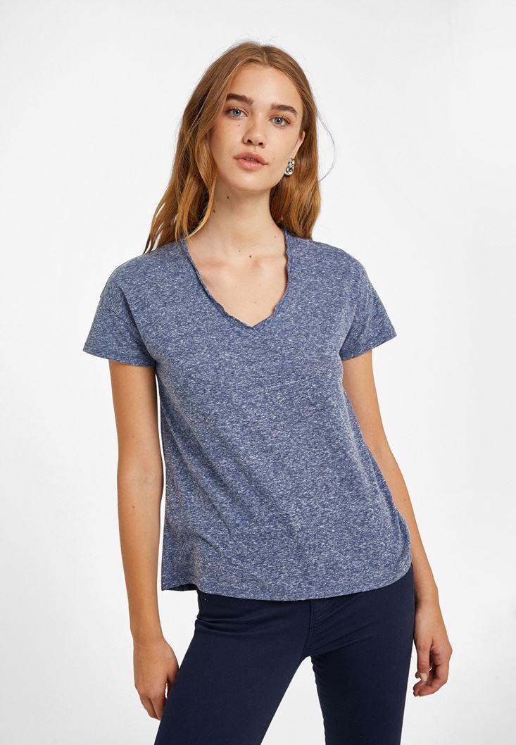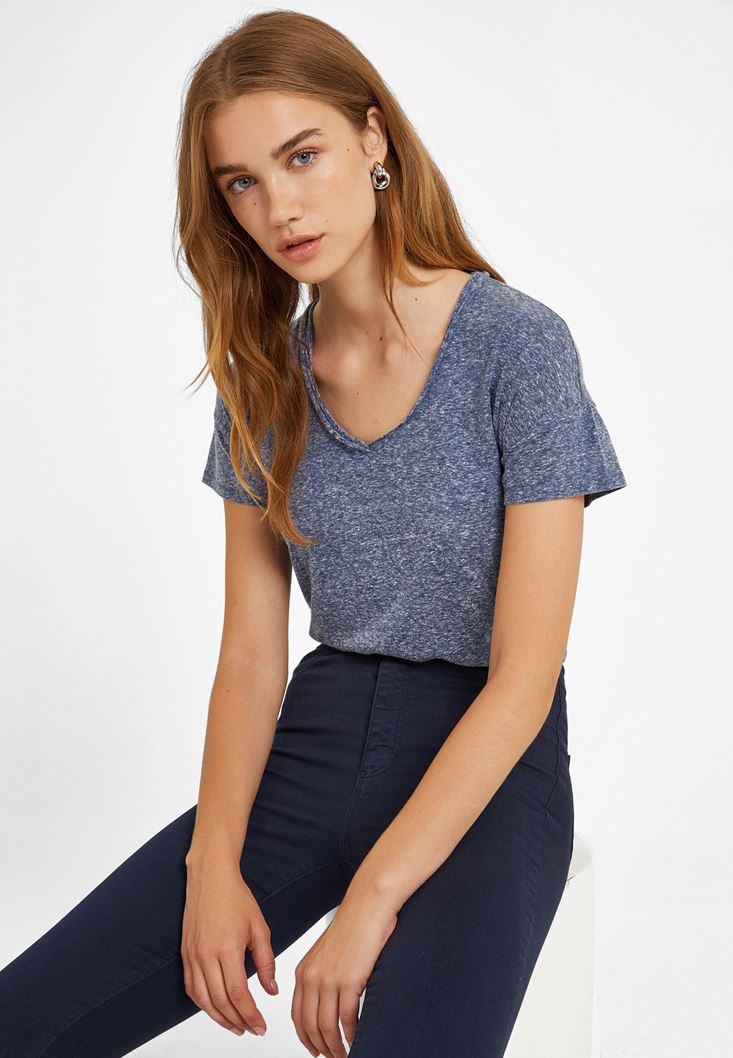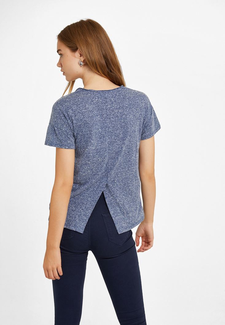 Lacivert Yırtmaç Detaylı V Yaka Tişört