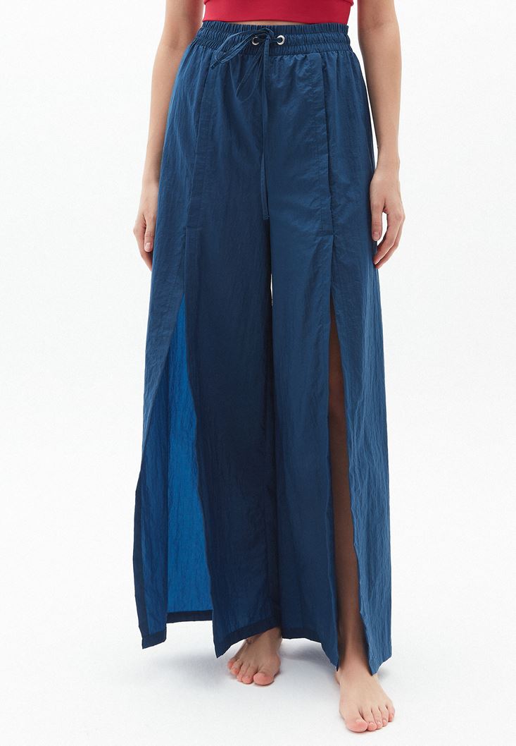Bedenden uzak rahat fit, bol paça, ultra yüksek bel, beli bağcık ve lastik detaylı, bacak boyu yırtmaç tasarımlı, yoga gibi egzersizler için uygun tasarım.