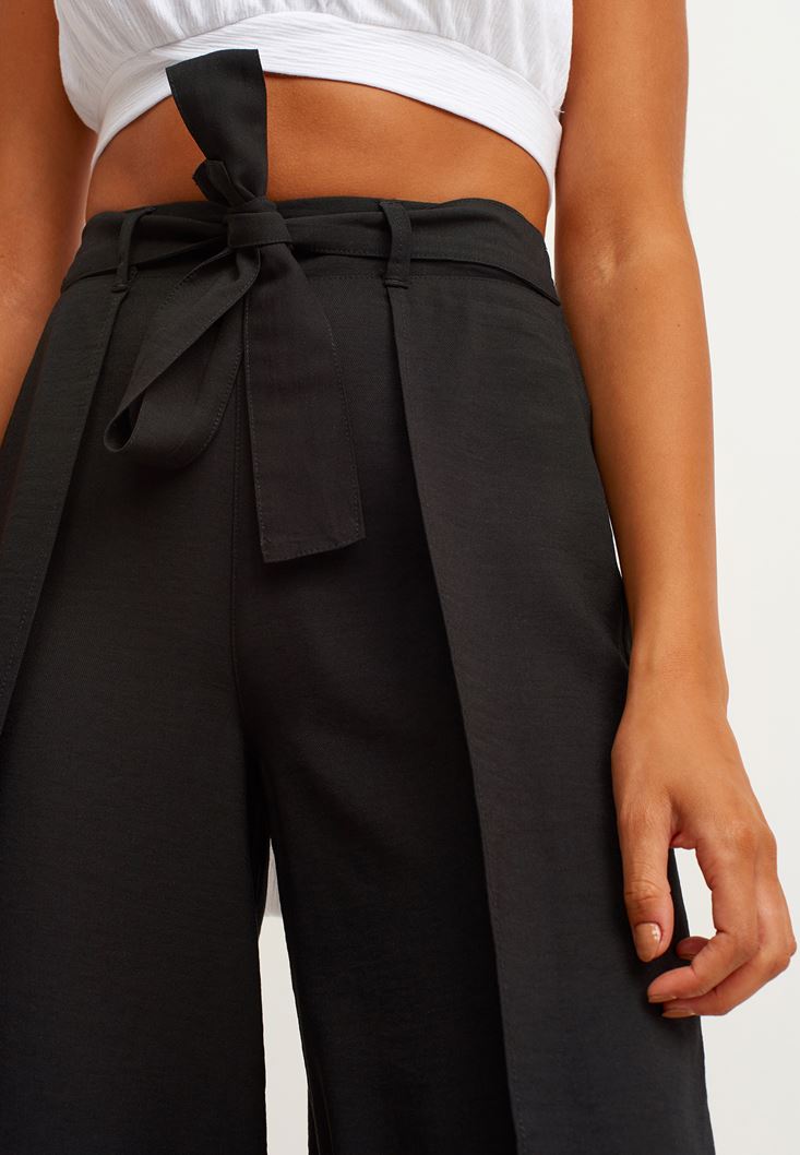 Viskon karışımlı içerik, ultra yüksek bel, kendi kumaşından kuşaklı, yırtmaç detaylı, geniş paçalı, bedenden uzak rahat kalıp.